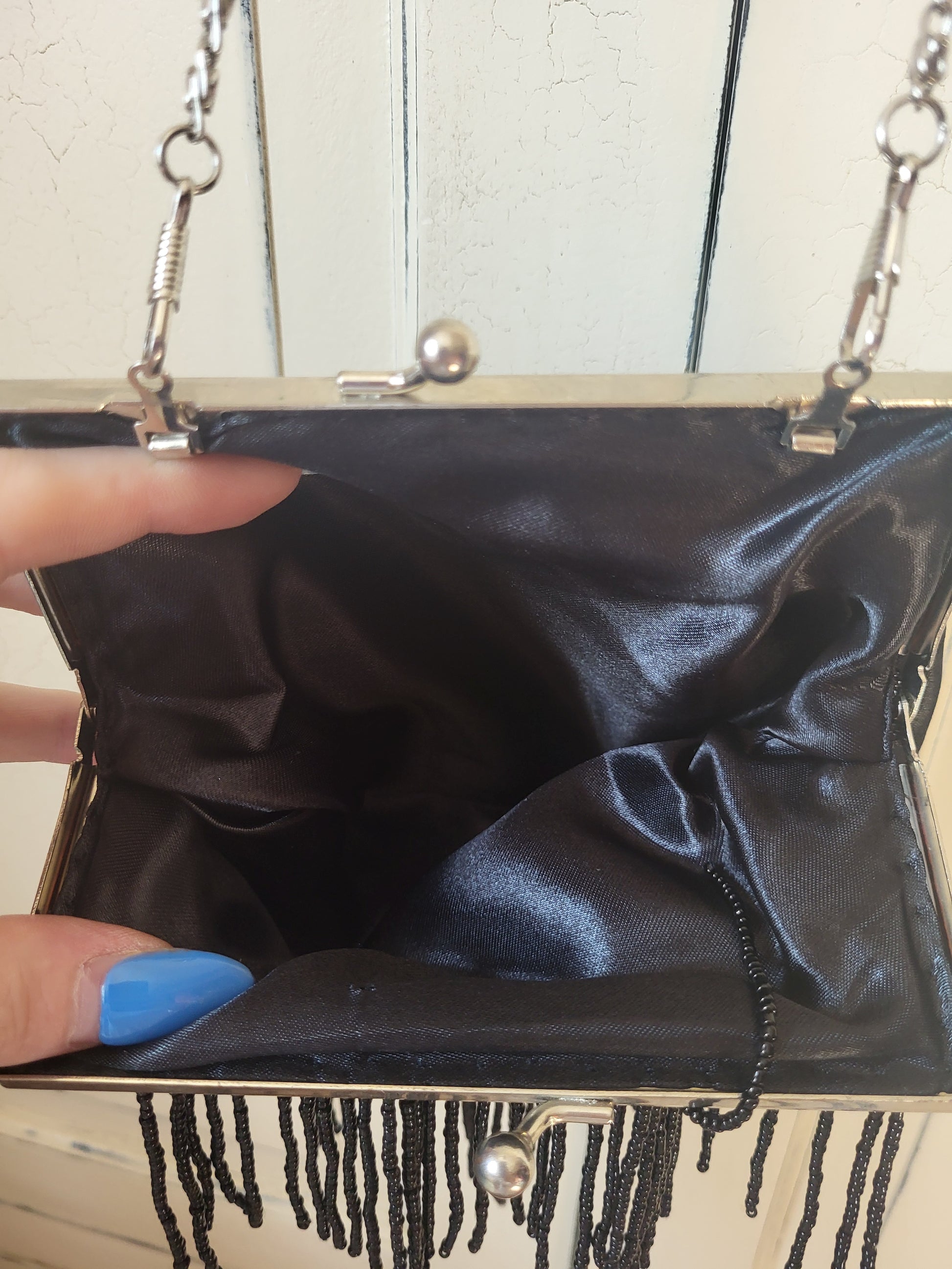 Features: Kiss-lock clasp, silver-tone chain strap, fringe beading detail