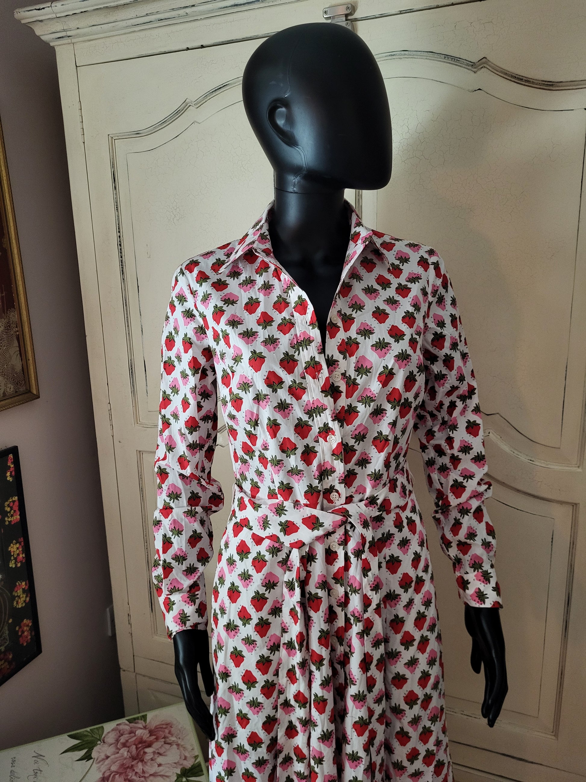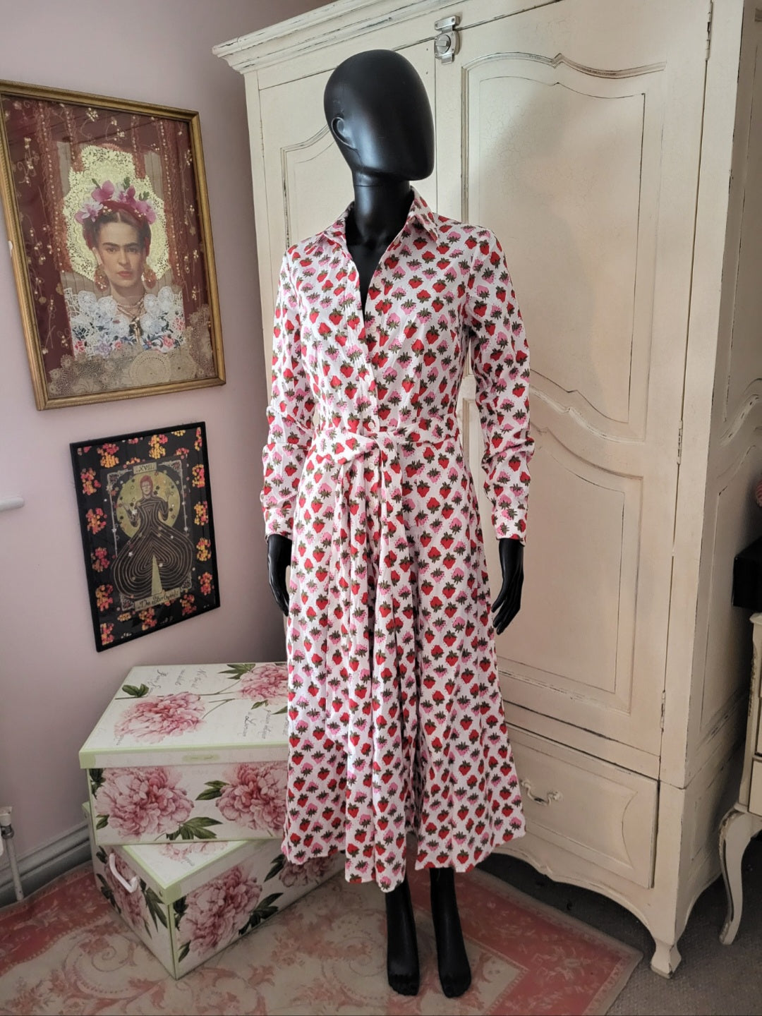 This gorgeous cotton dress is beautiful quality and features a fitted shirt bodice and slightly A-Line skirt. The tie waist ensures a flattering silhouette.