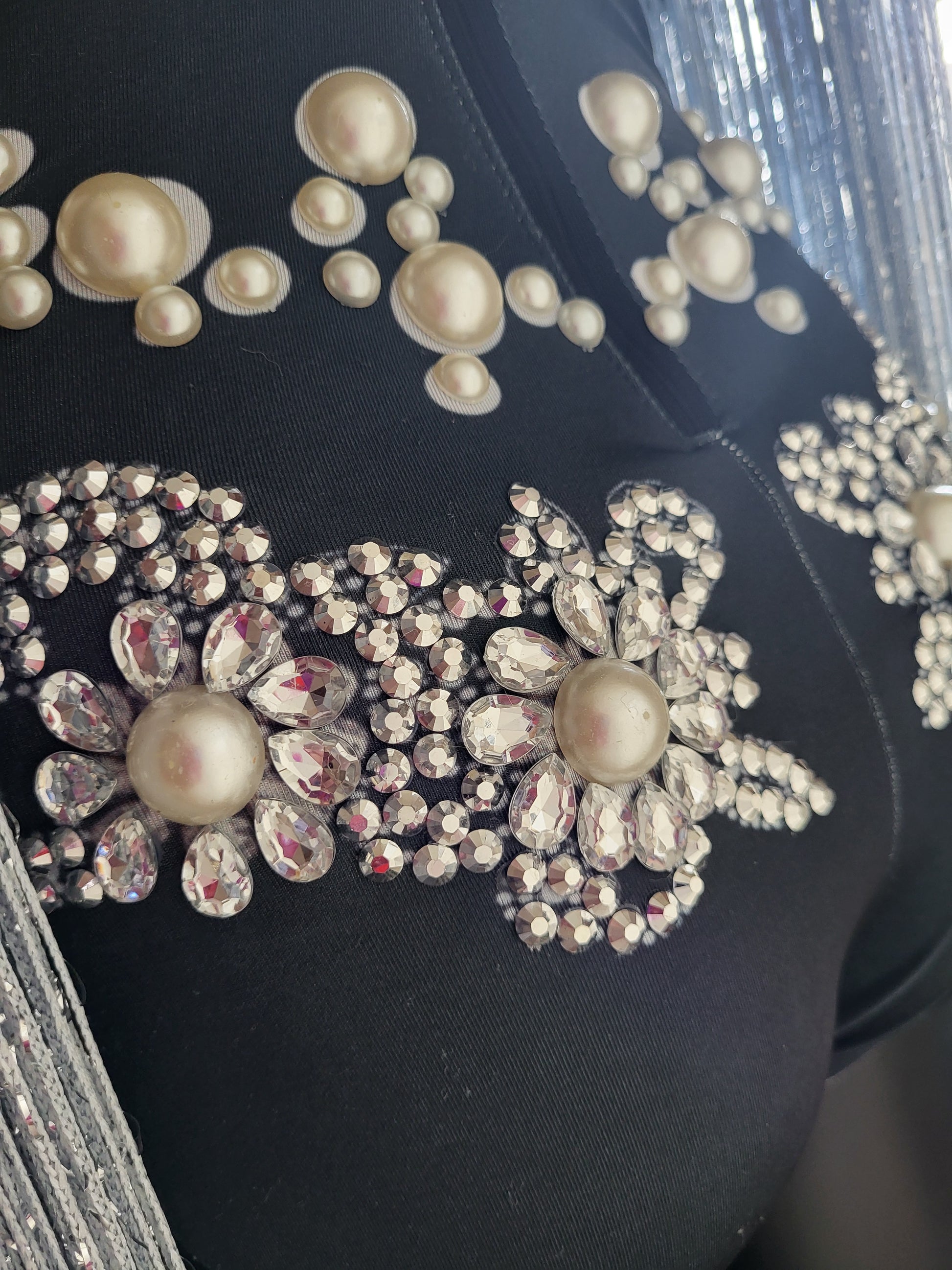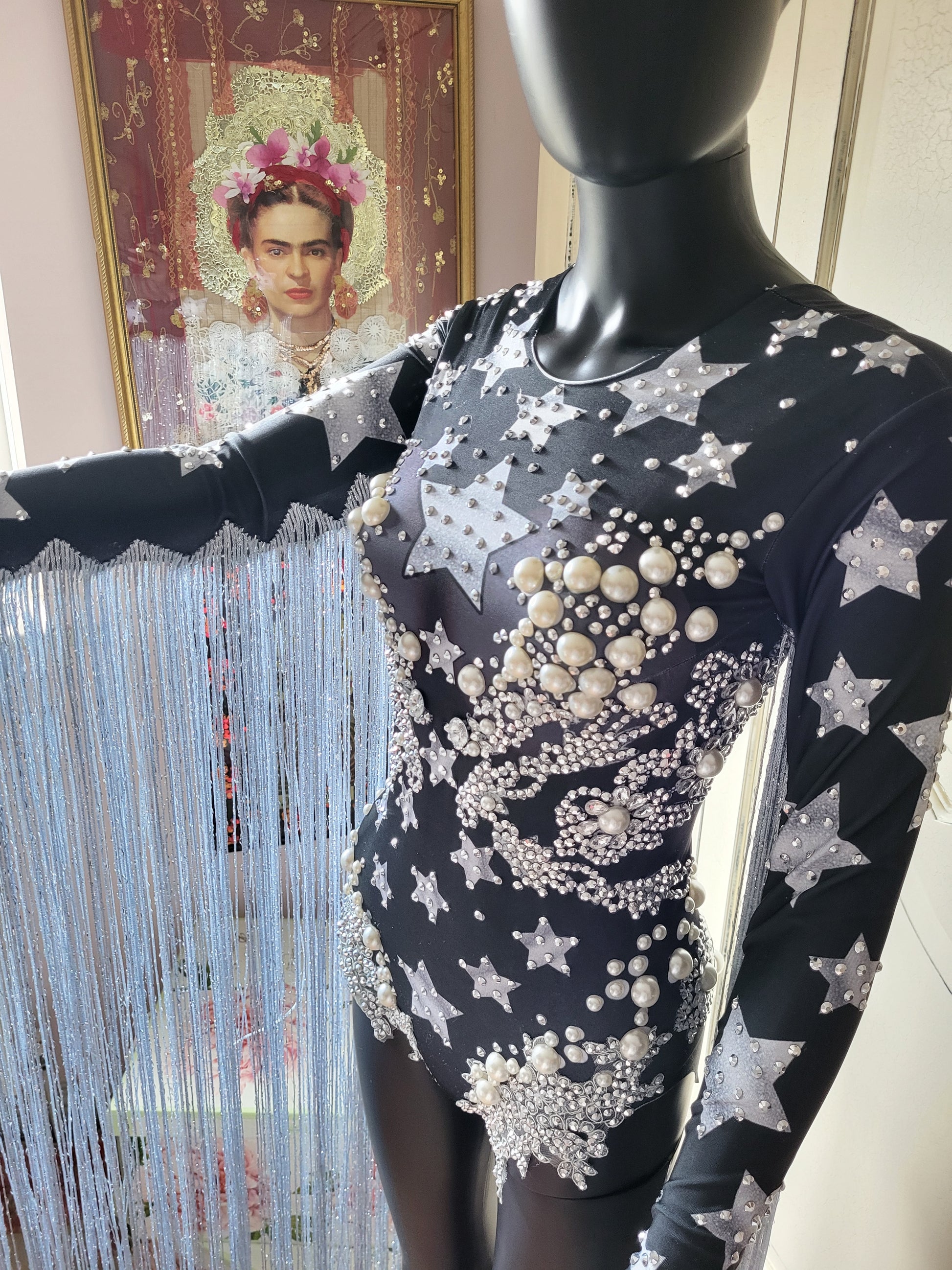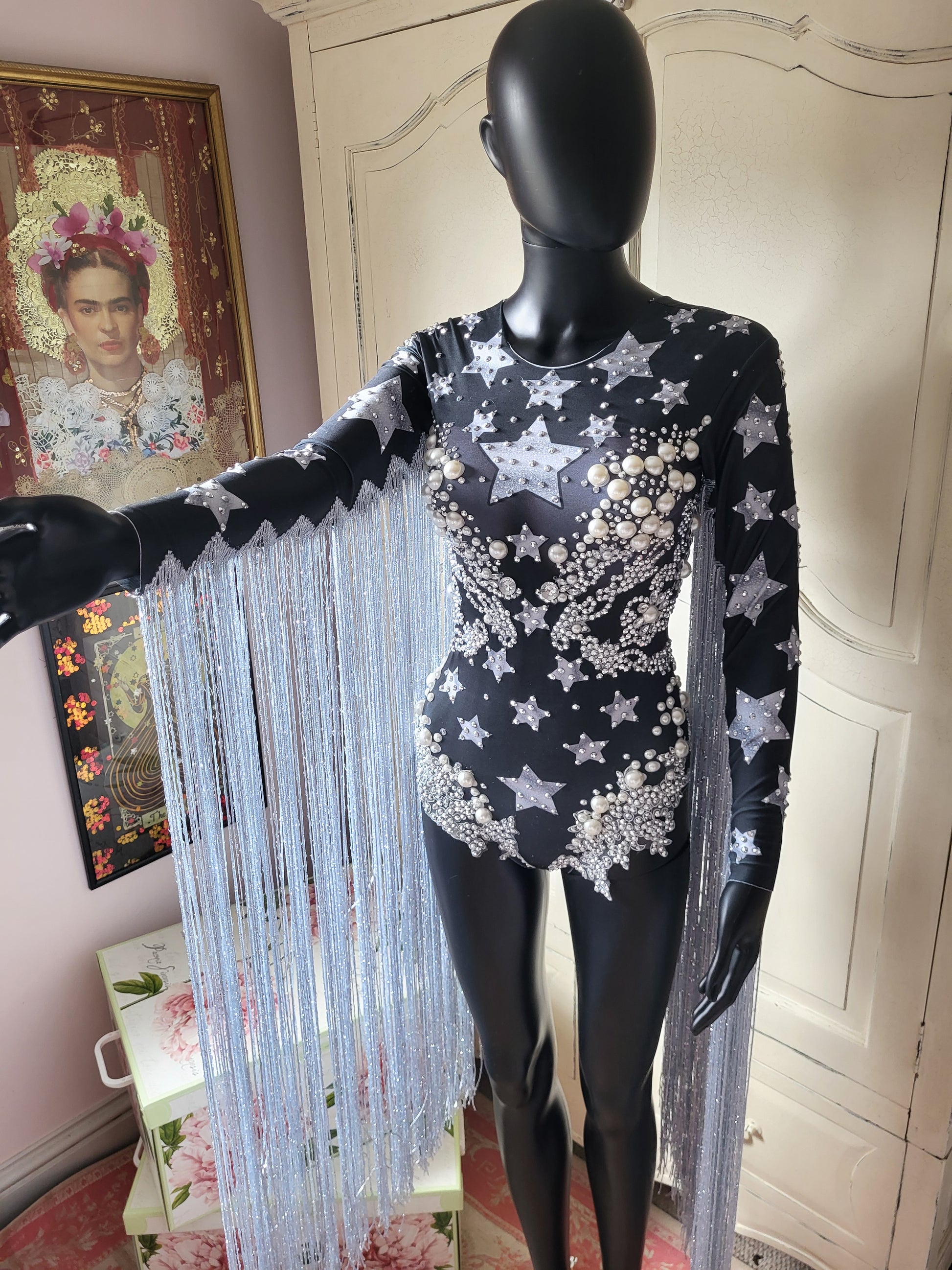Make a truly dramatic statement in this dazzling Born in Stockholm Star Fringe Bodysuit. Embroidered with faux crystals, oversized faux pearls, and shimmering sequins, it is unapologetically bold and eclectic — designed to sparkle under the lights!