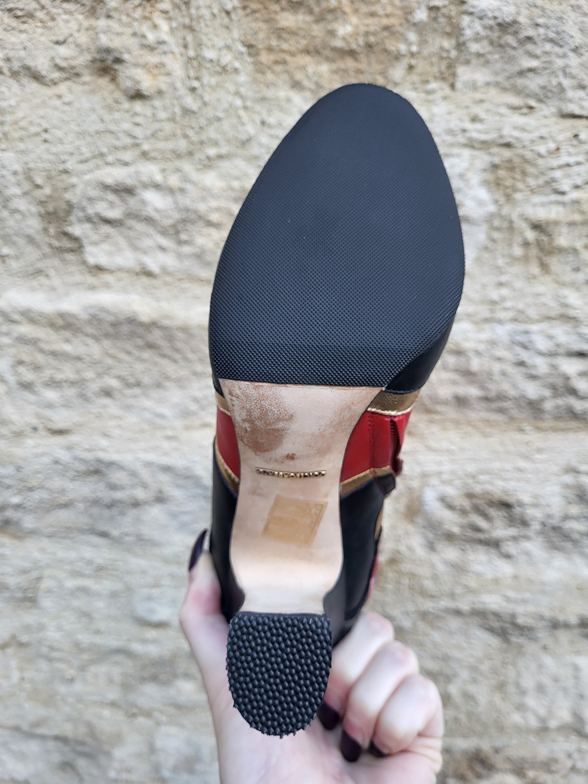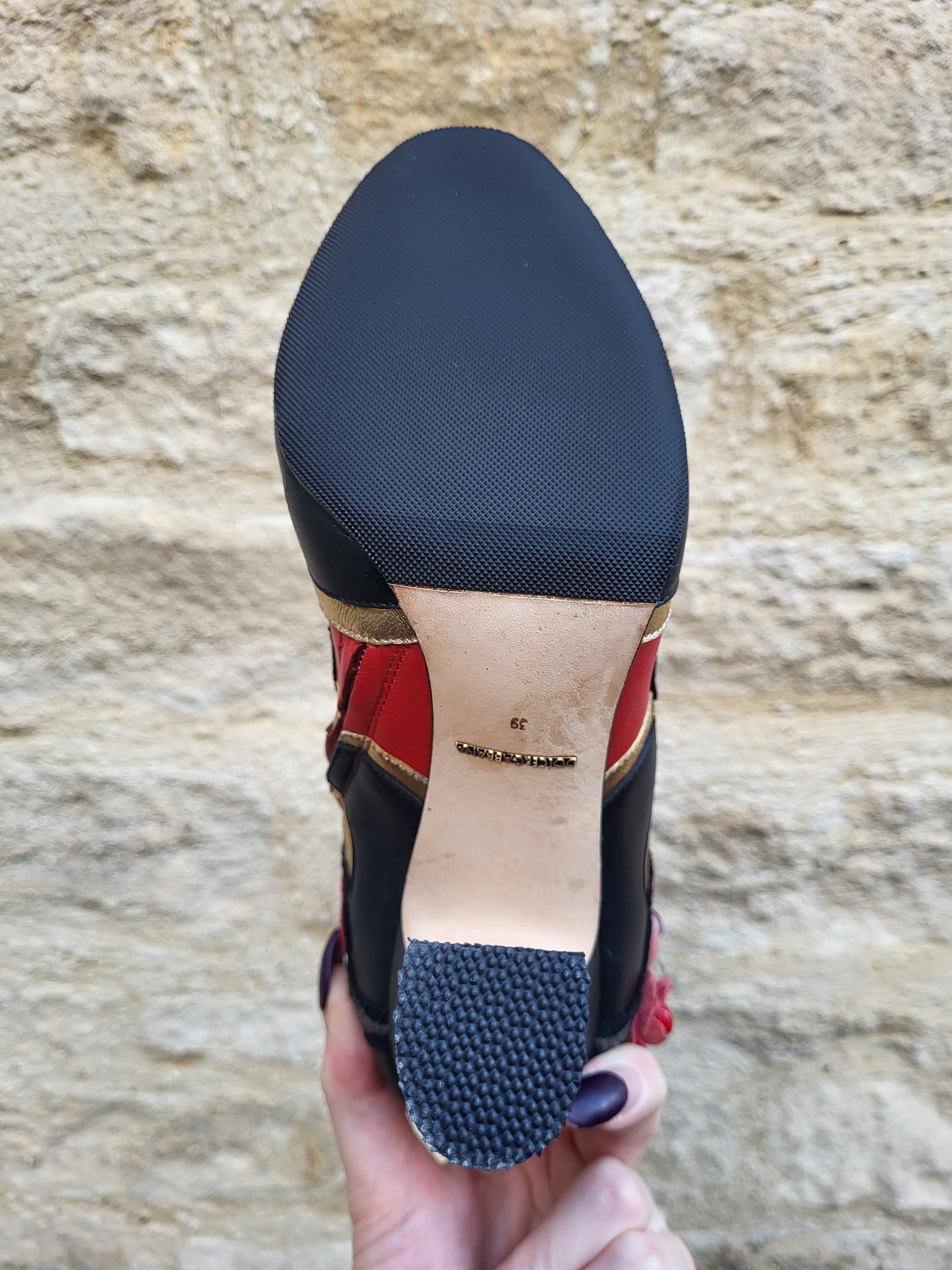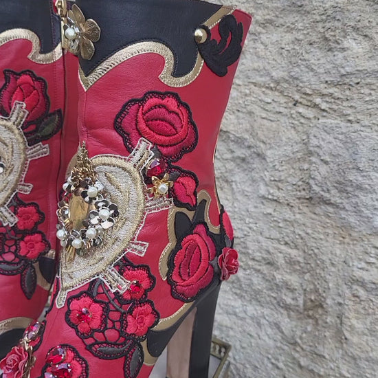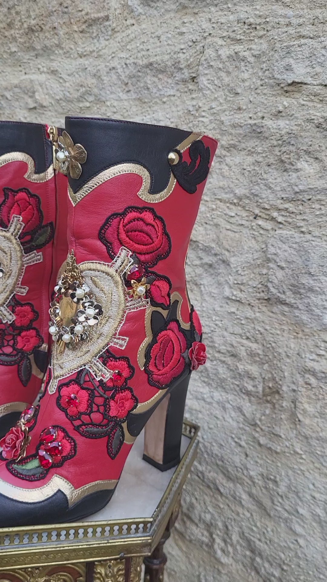 Made in Italy and rooted in Dolce & Gabbana’s flair for bold, maximalist footwear, these vintage boots pair red leather with black and gold accents, elaborate embroidery, floral appliqués and ornate crystal-embellished hearts down the shaft. The result: a rich, theatrical silhouette that commands attention. Expertly constructed with a fitted mid-calf shaft, a sculpted high heel and a slightly pointed toe, the boots fuse runway-level drama with wearable structure. Their design aligns with the brand’s embellished “Enchanted Heart / Roses” boots series, a rare and collectible expression of D&G’s couture-inspired footwear oeuvre.