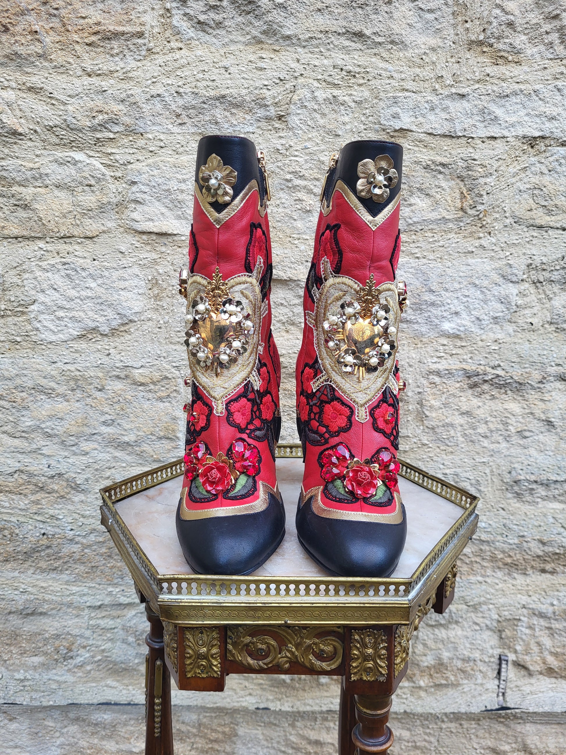 • Ornate Dolce & Gabbana detailing — embroidery, appliqué flowers and crystal-studded heart motifs emblematic of the brand’s more theatrical mainline boots.