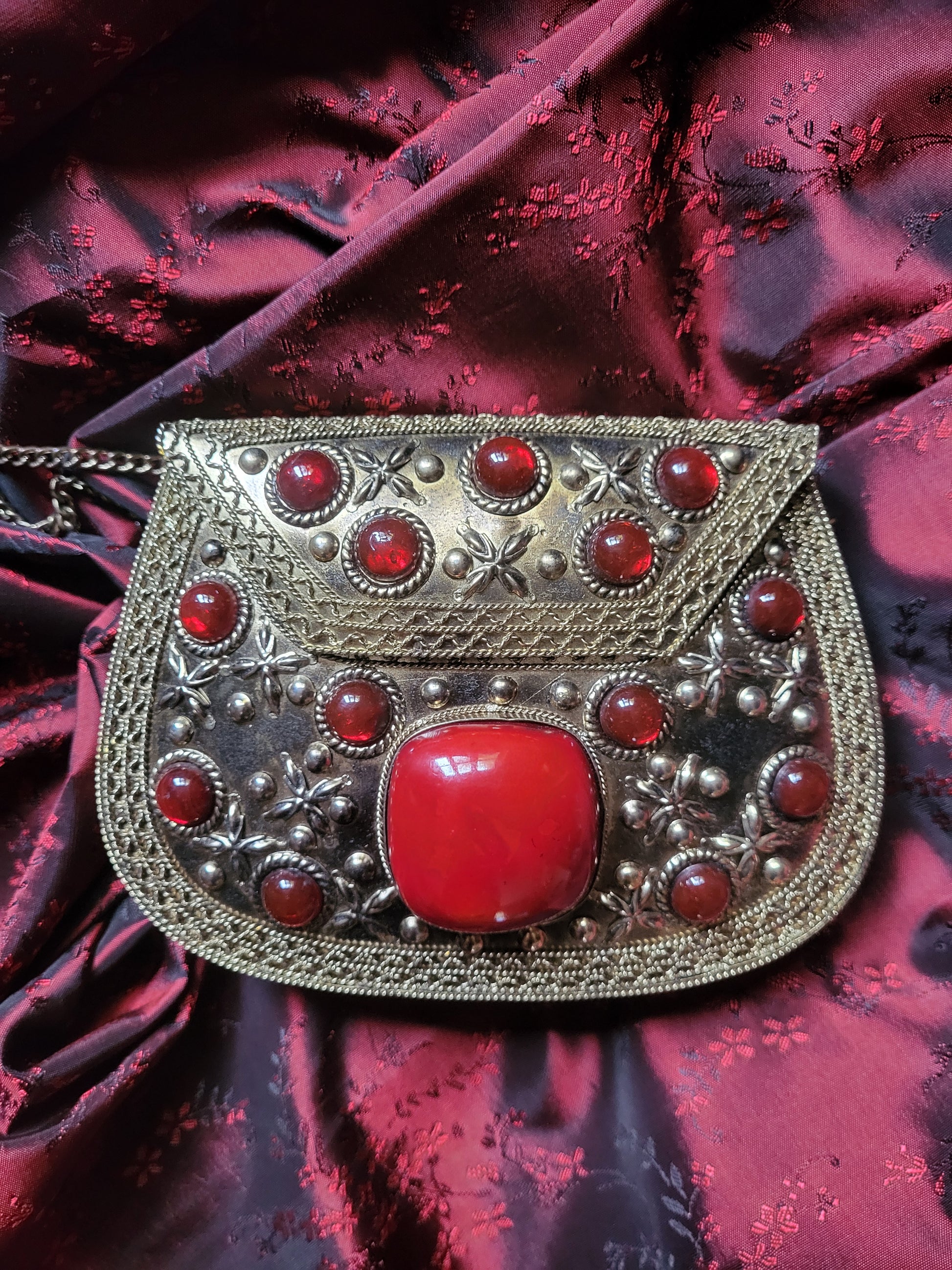 Handmade and originally sourced from Harrods, this ornate metal shoulder bag has been intricately worked in gold metal with baroque floral motifs and deep red cabochons. Natural patina and slight tarnishing softly enhance its opulent character.