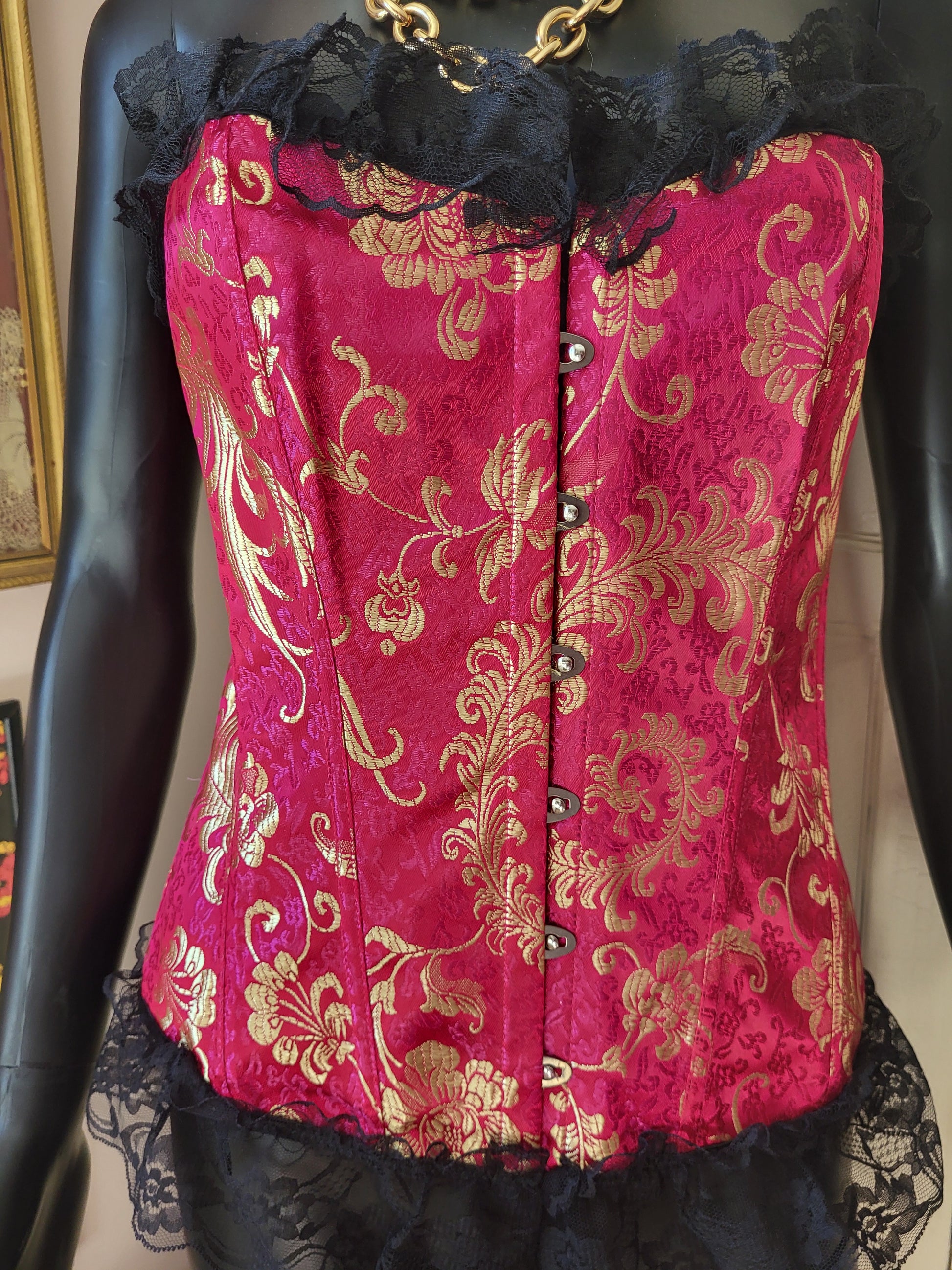 An exquisite Gold and Fuchsia Basque by Rouge Roses Lingerie. The colours are so rich and opulent and the faux satin material has a slight sheen to it. Have a magnificent Moulin Rouge moment!