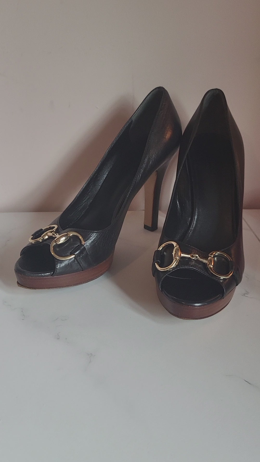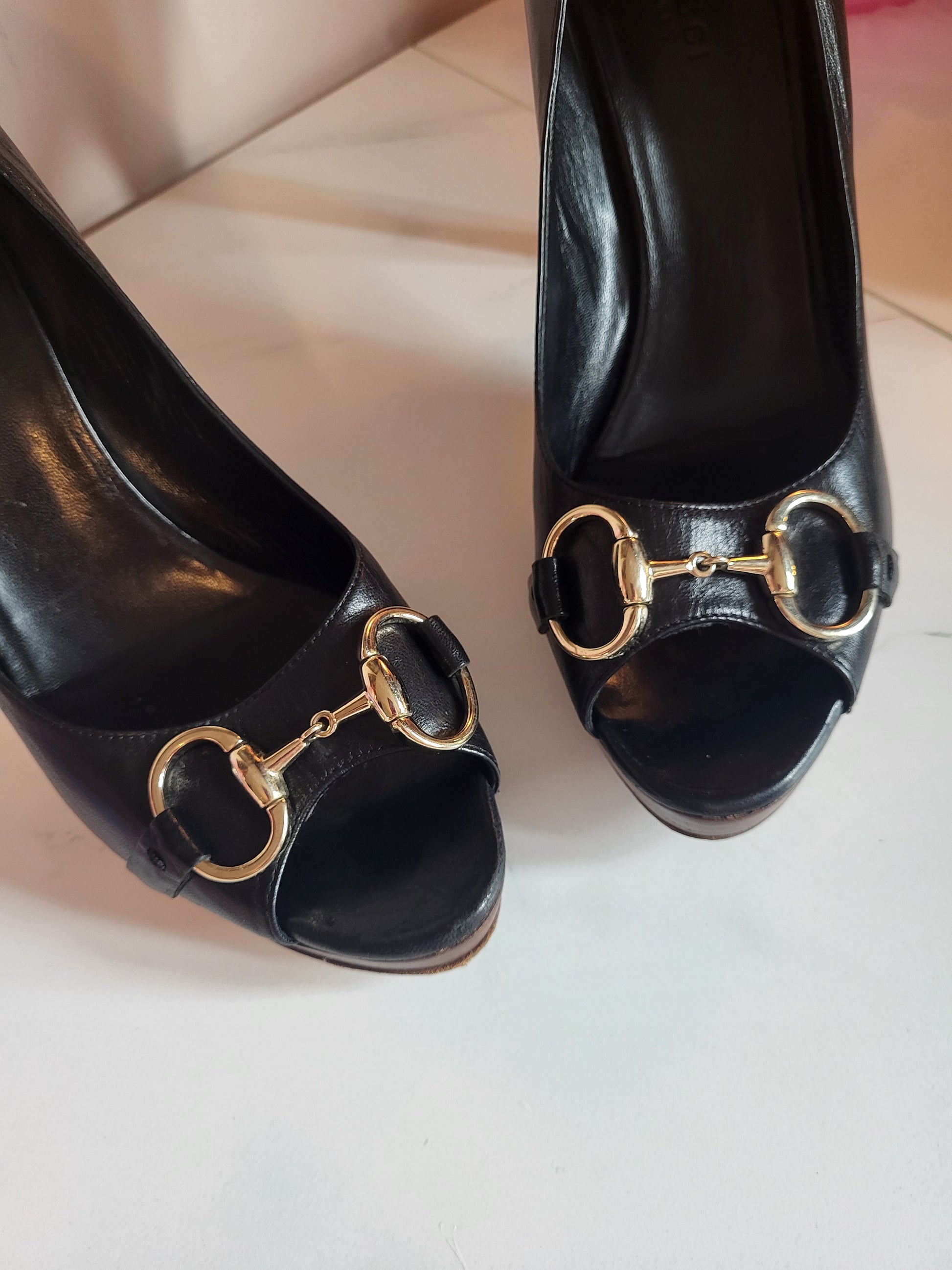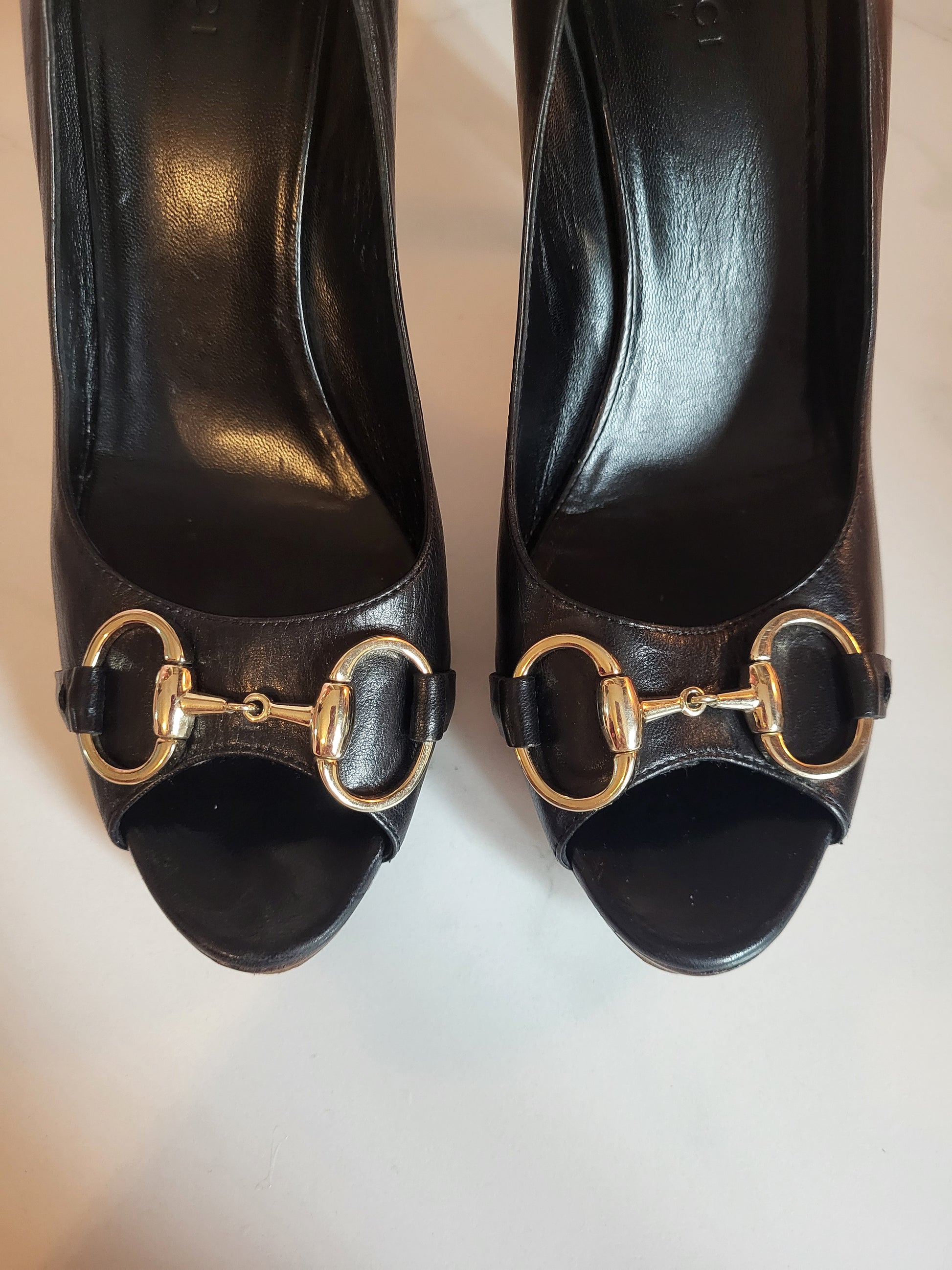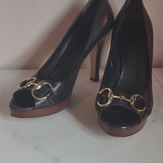 Gucci Black Classic Horsebit Peep Toe Platform Heels