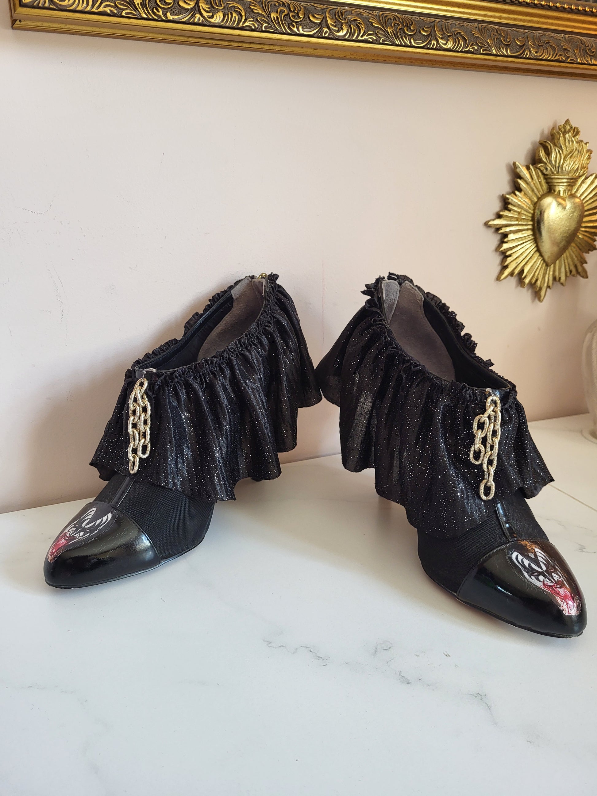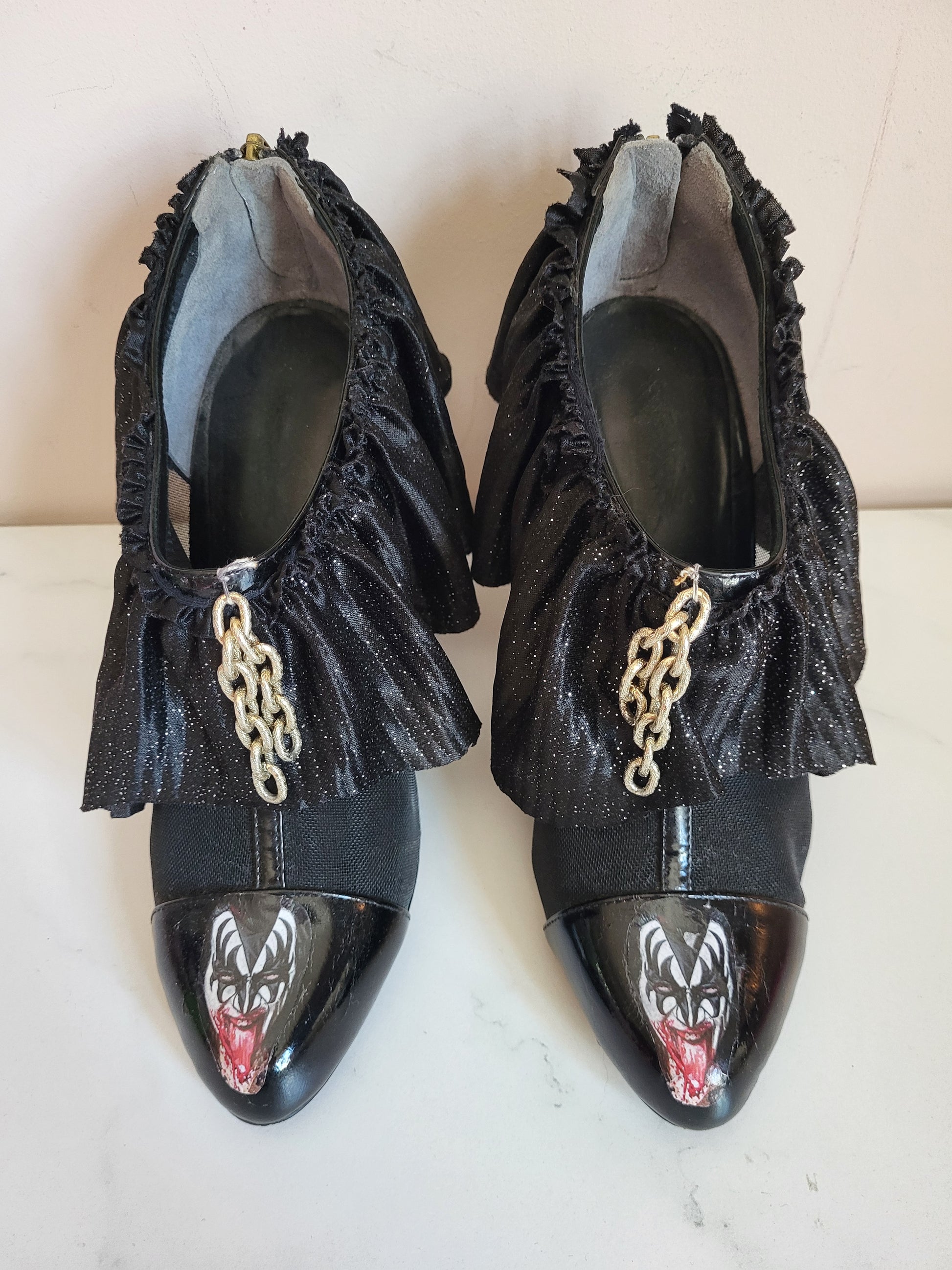 Step into wearable art! These dramatic heels have been transformed from classic Reiss stilettos into gothic rock couture...a true one of a kind statement piece. Each boot features Gene Simmons’ legendary KISS “Demon” face hand-applied to the toe, and is finished with deliciously decadent sheer black ruffled fabric!