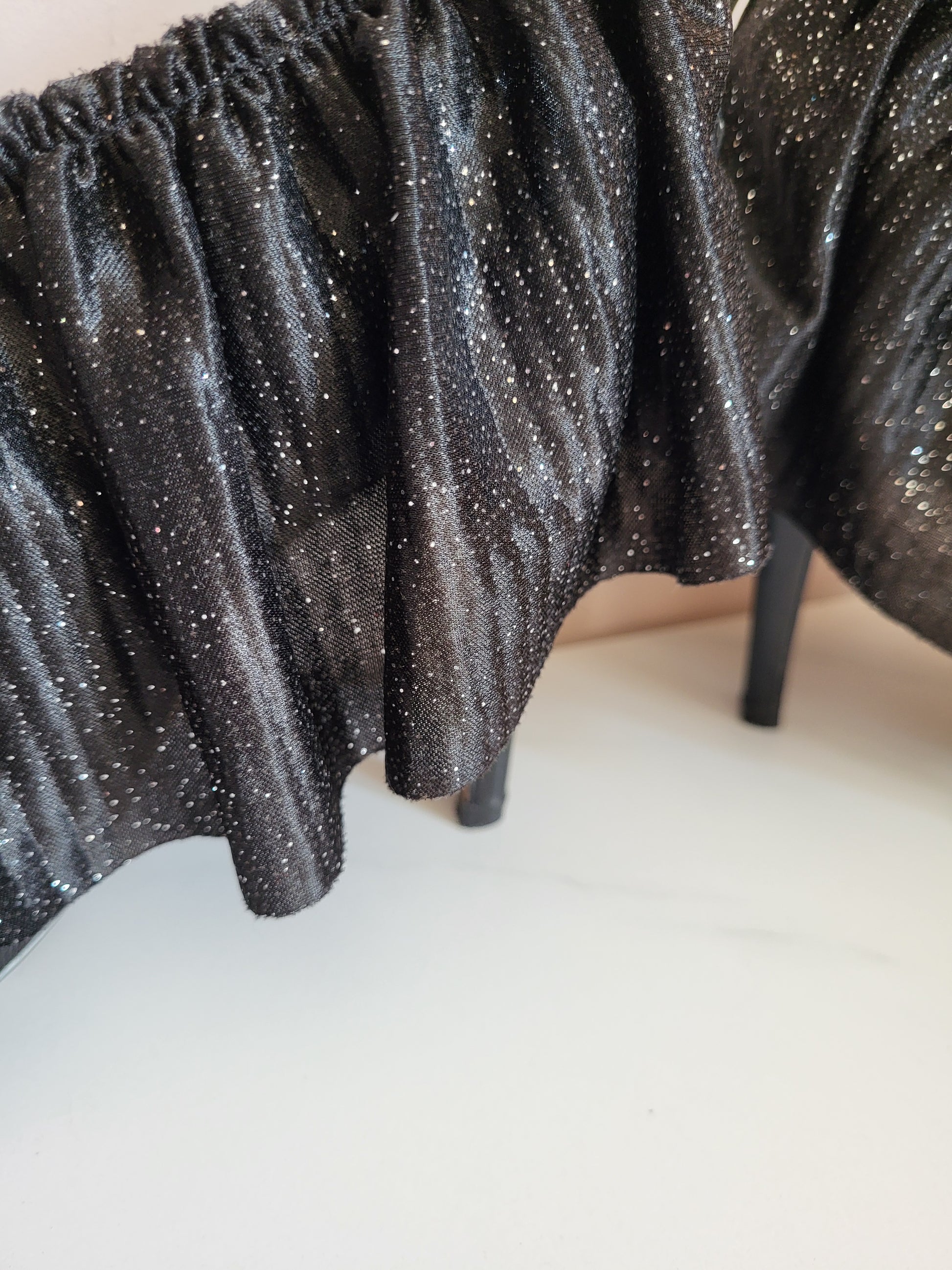 - Dramatic ruffled glitter fabric and statement gold chain detail