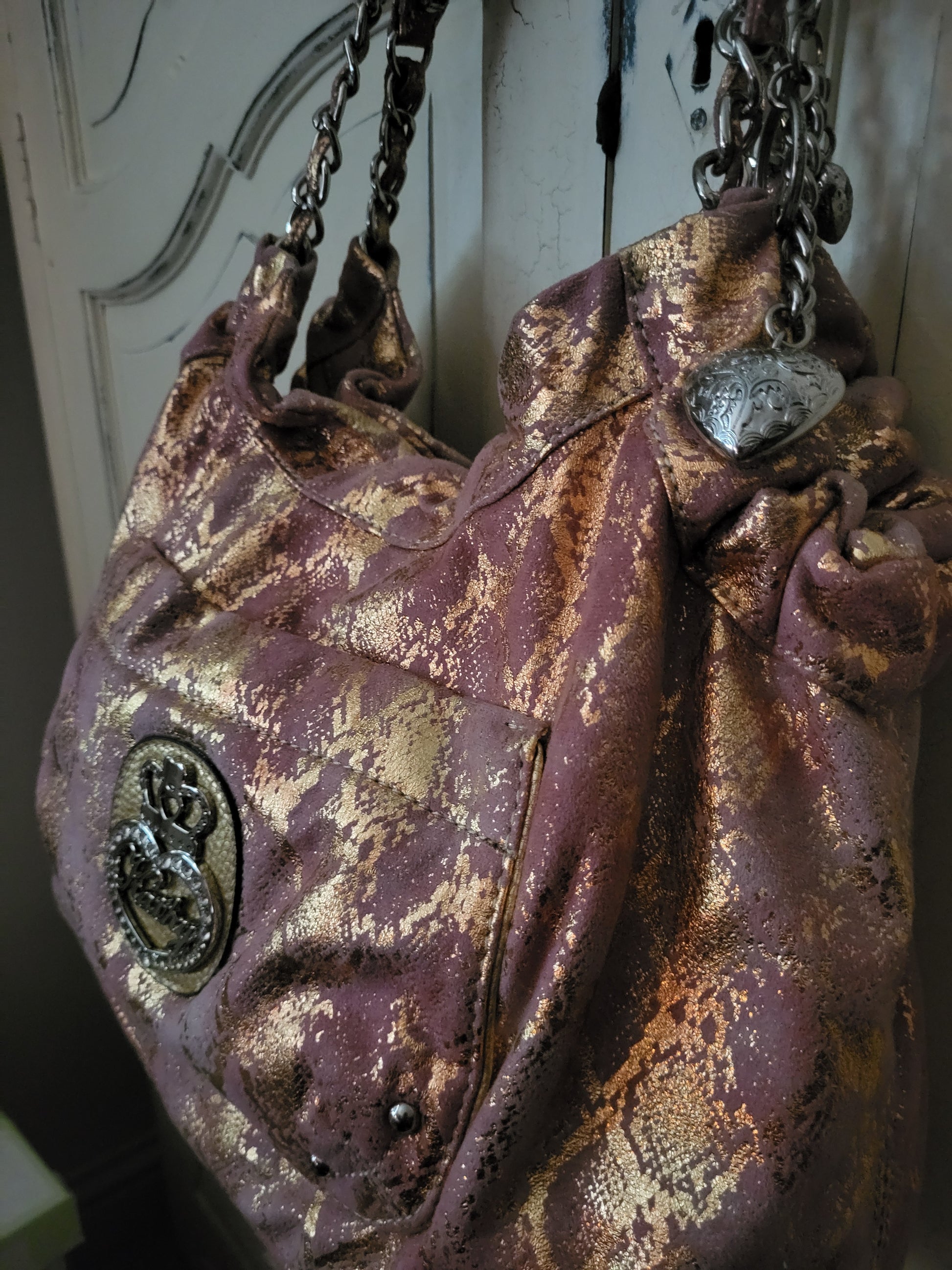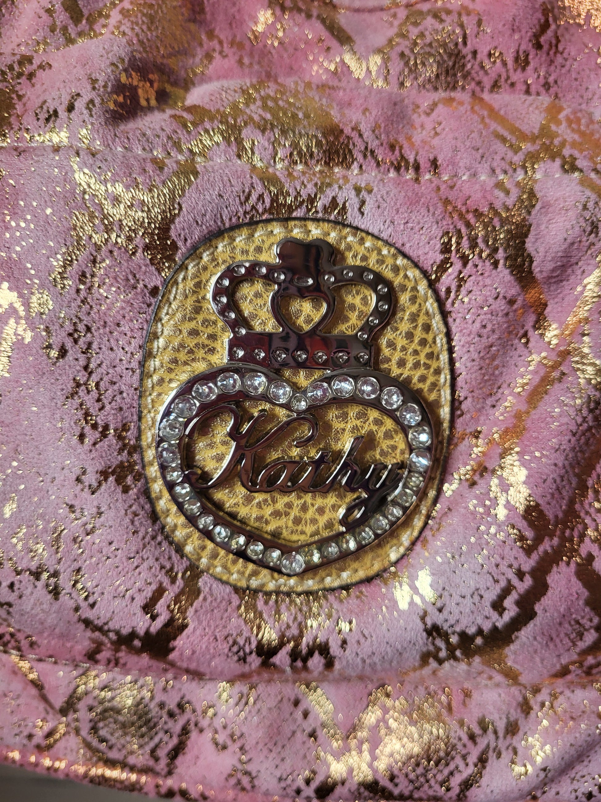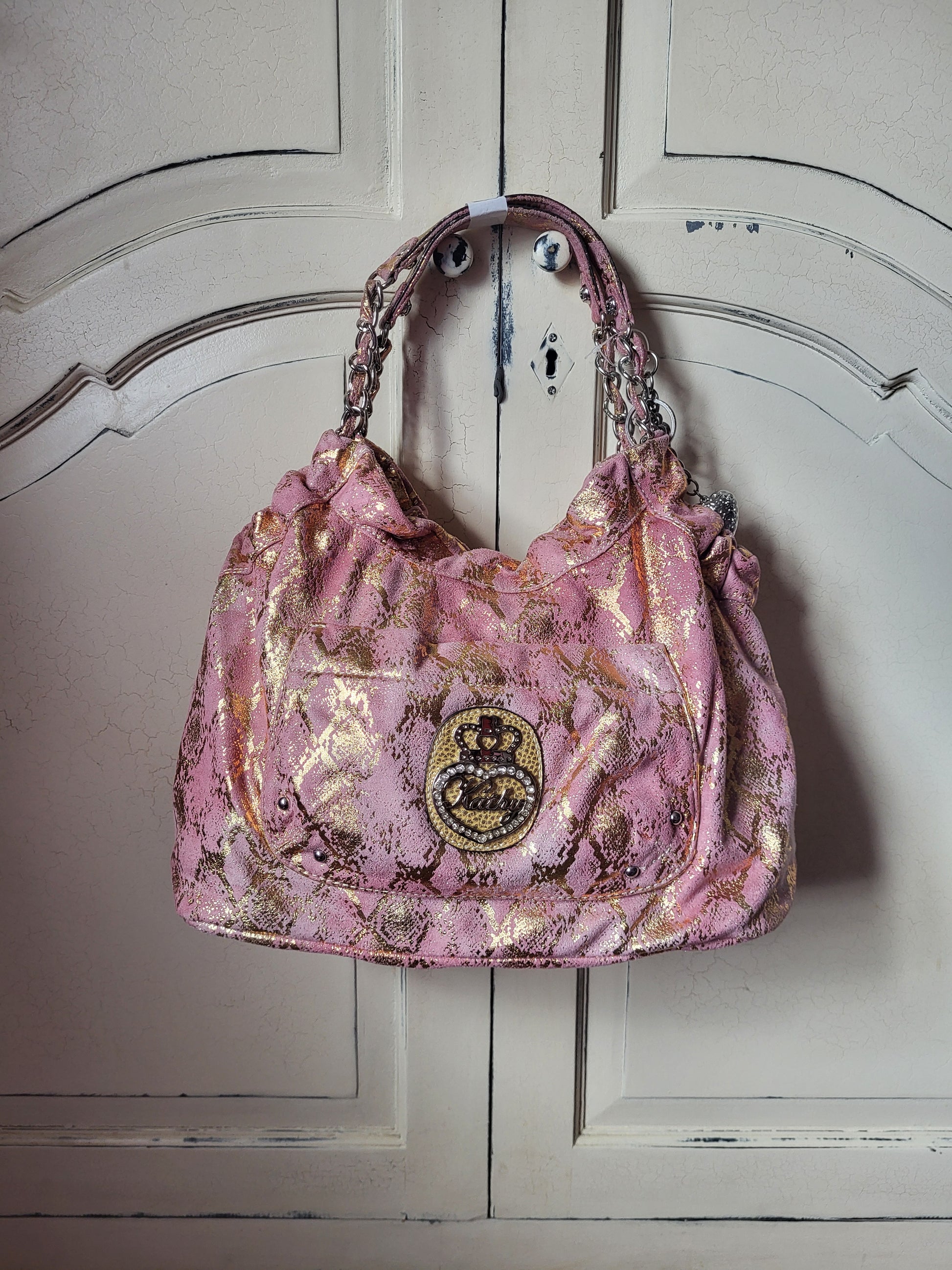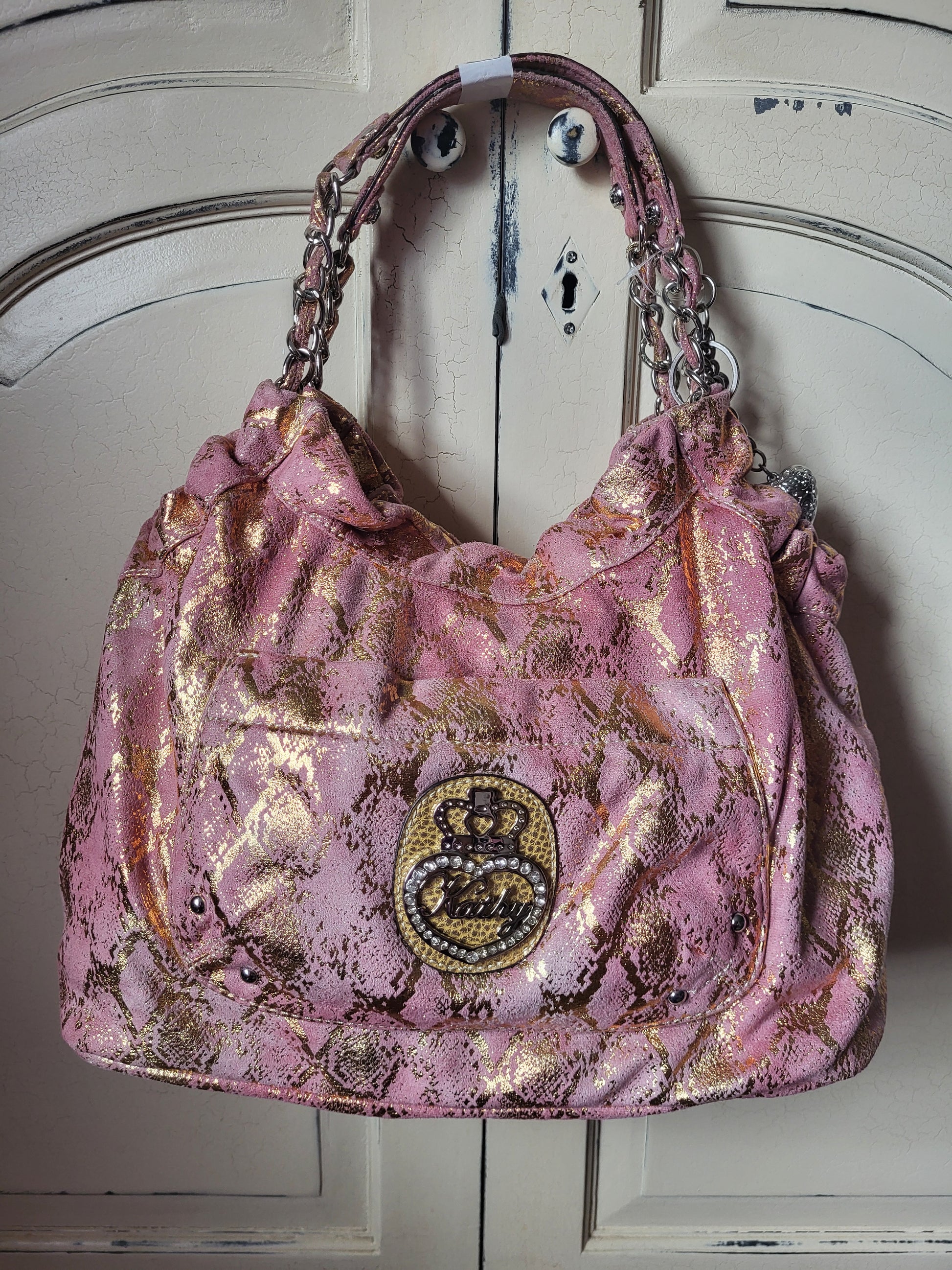 This gorgeous gold and pink Hobo bag by Kathy Van Zeeland is a beautiful item. It is lovely to touch and handle, with a soft imitation Suede exterior featuring metallic gold detailing. It is adorned with the Kathy Van Zeeland diamante chunky crown emblem on the front, and beautiful charms attached to the top of the bag.