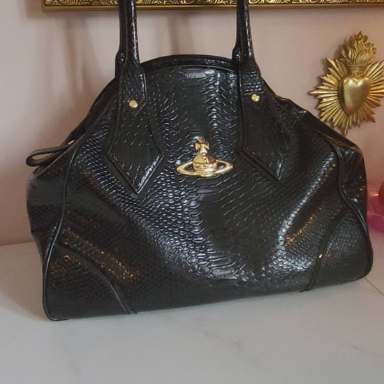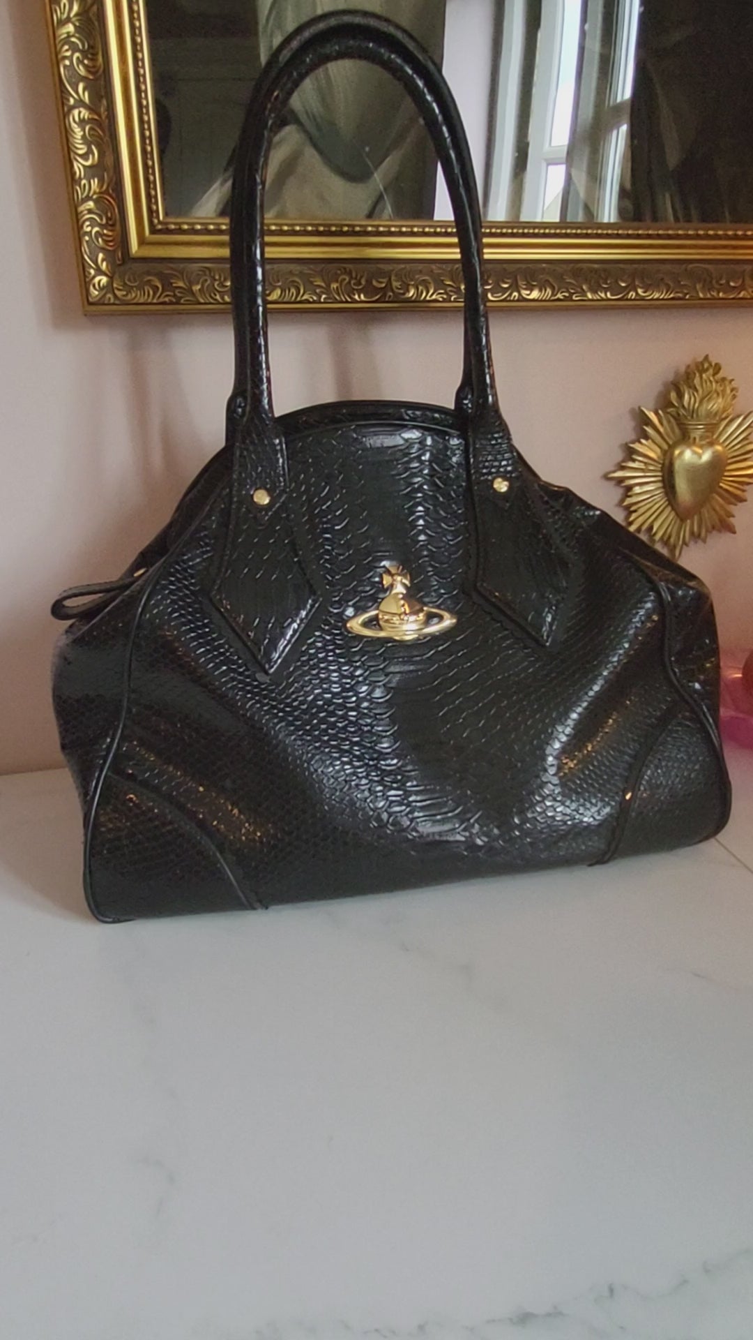 A striking oversized Orb handbag from Vivienne Westwood, crafted in glossy patent faux leather with embossed croc detailing. The bold texture and gleaming gold Orb emblem make this piece instantly recognisable — a true statement of Westwood’s fearless style.
