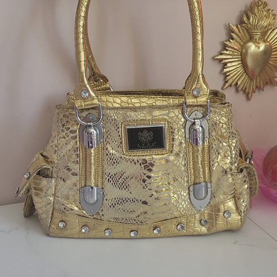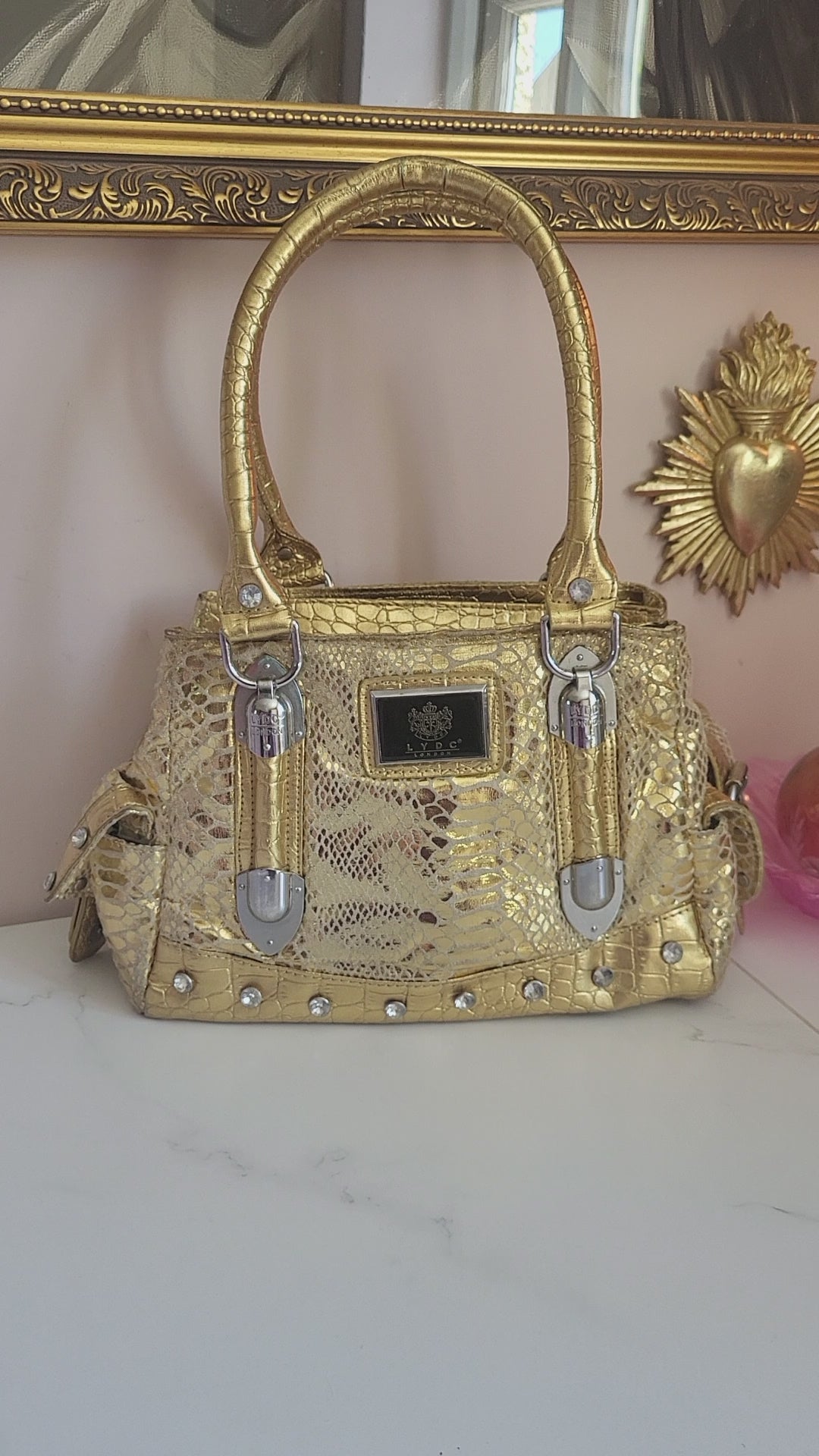 A gorgeous little soft faux snakeskin gold mini bag with large rhinestone studs.