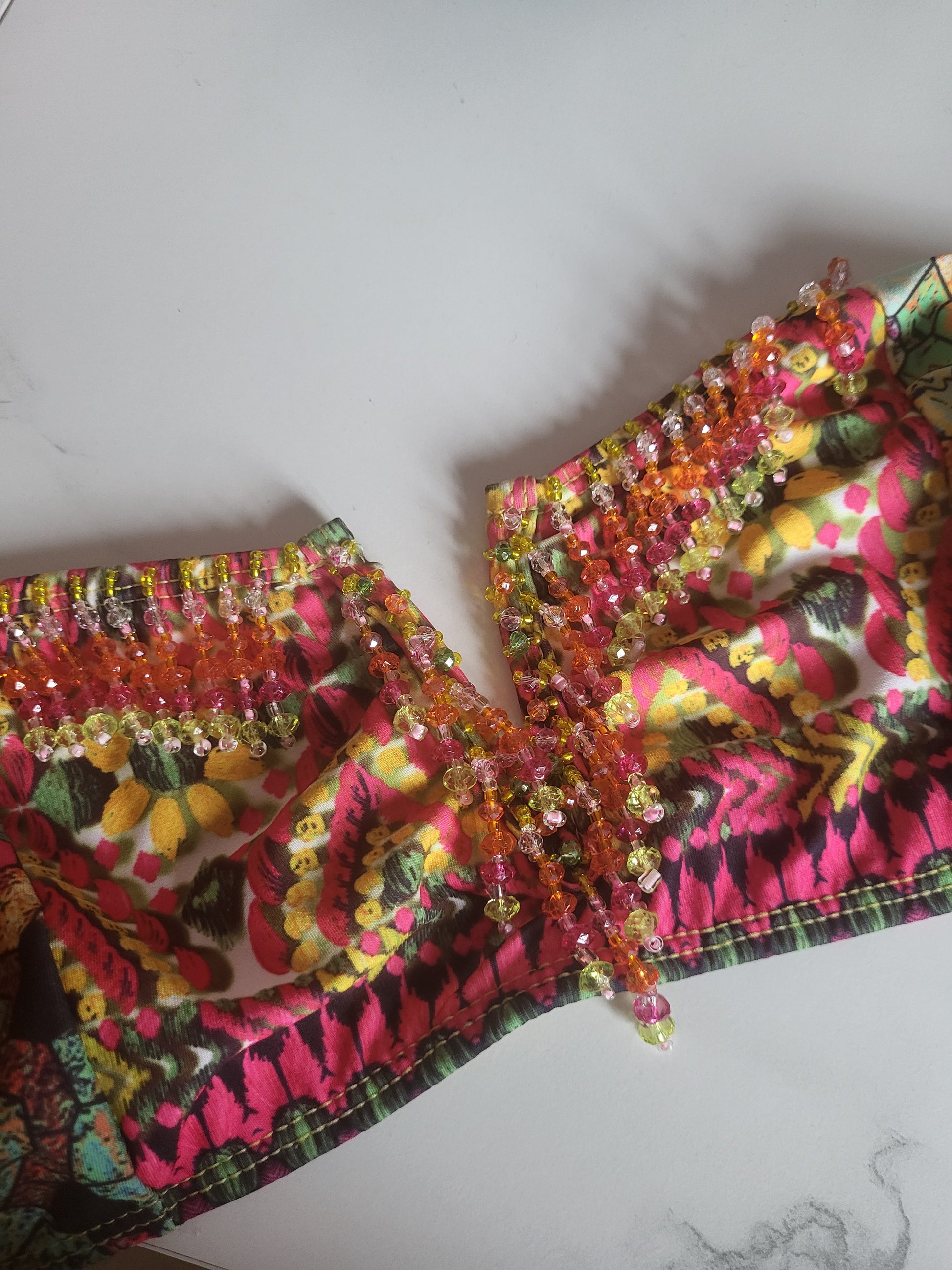Gorgeous Paradizia Bikini with hand sewn beading. The bikini bottoms feature a flattering v shape and the bandeau top is fastened with a tie at the back.