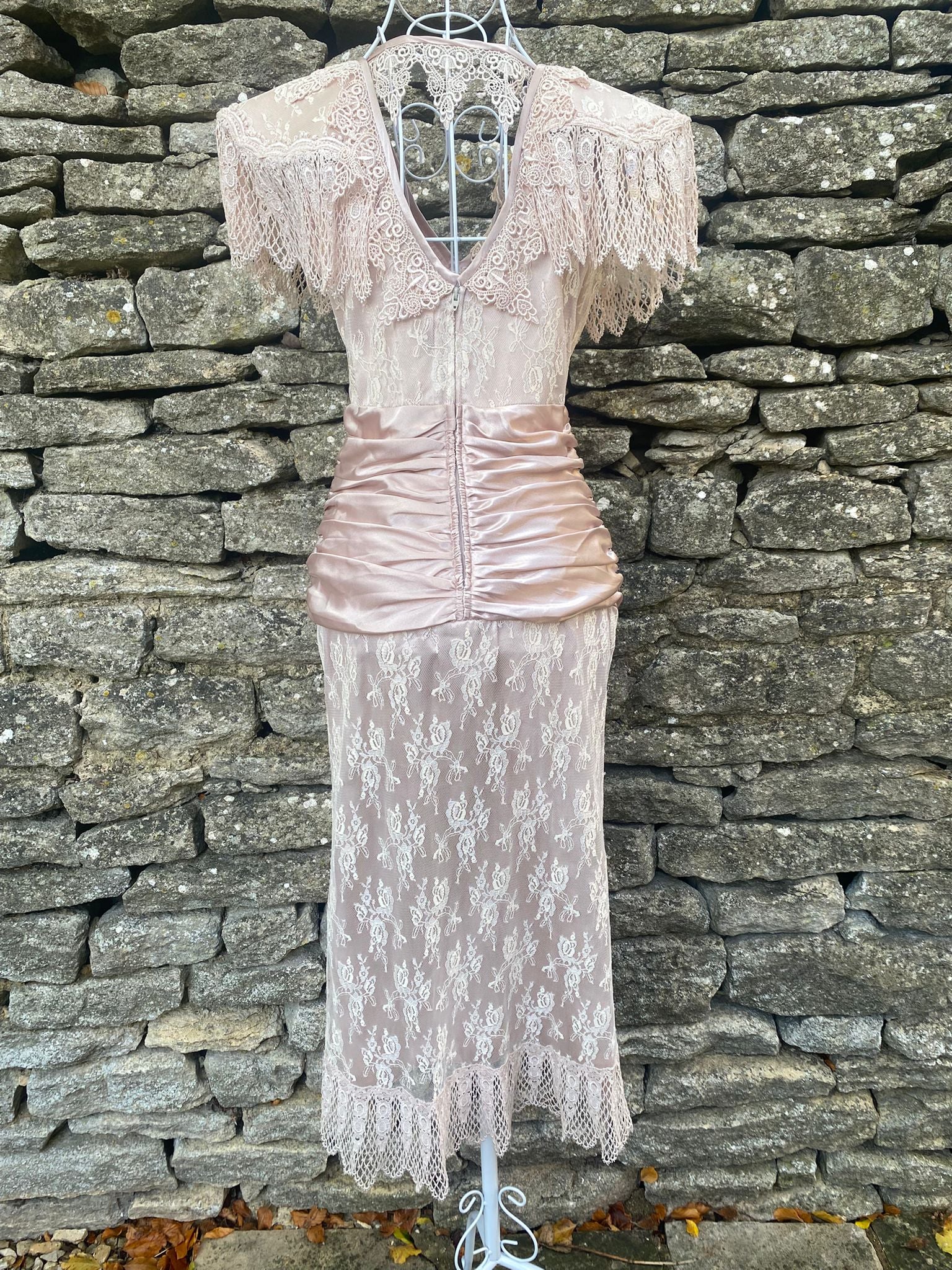 - Exquisite 1980s vintage design, blending delicate lace with soft blush satin for a soft romantic aesthetic