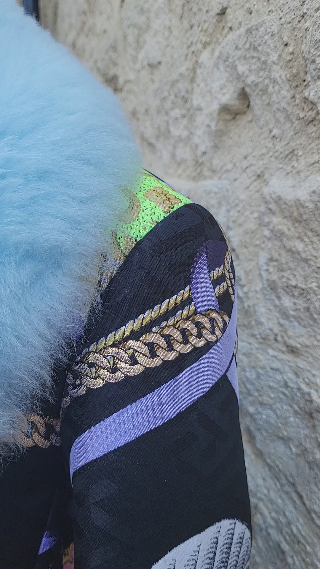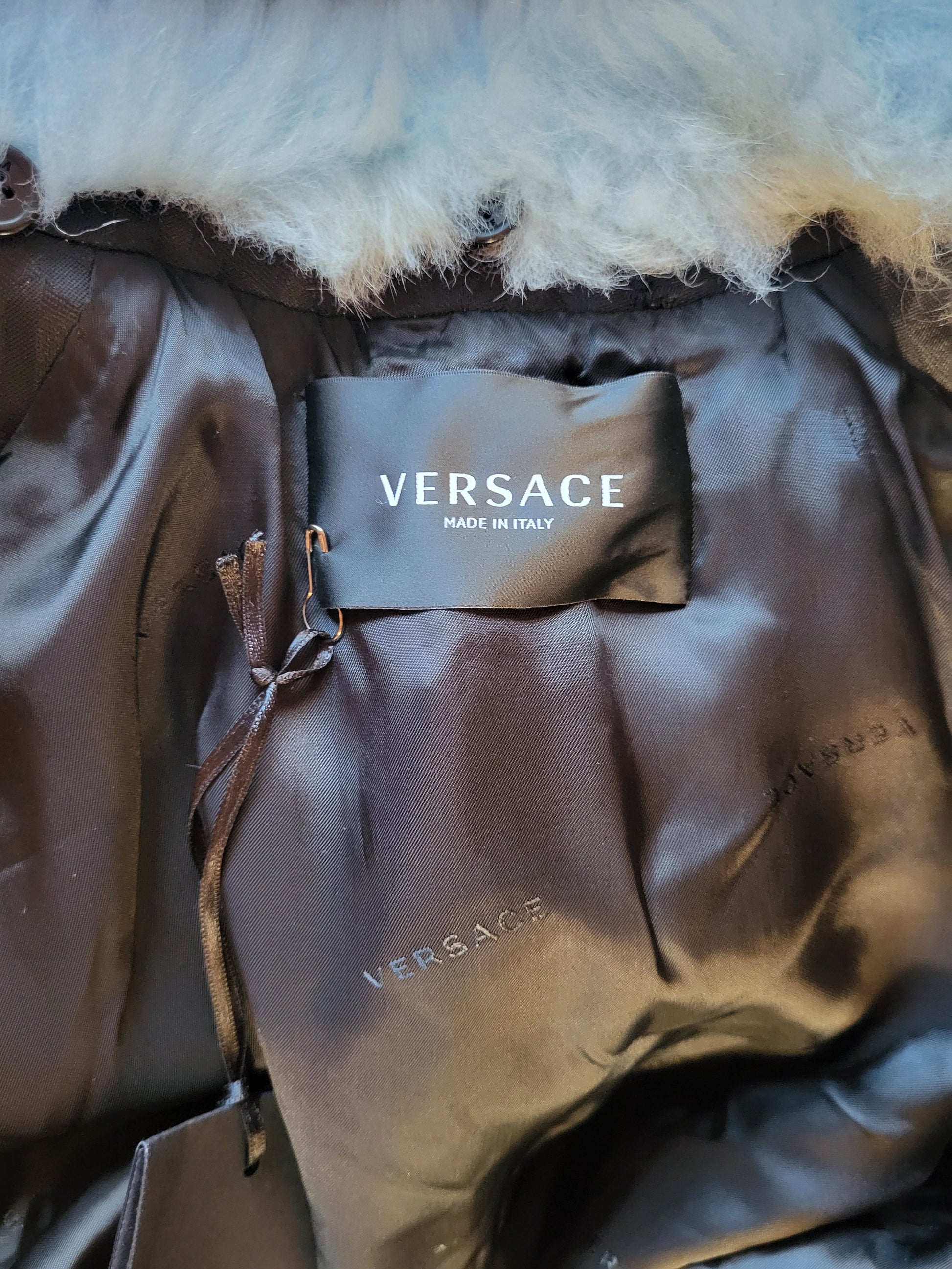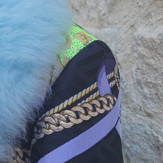 A statement Versace brocade coat defined by an opulent blue faux fur collar and intricate baroque detailing.