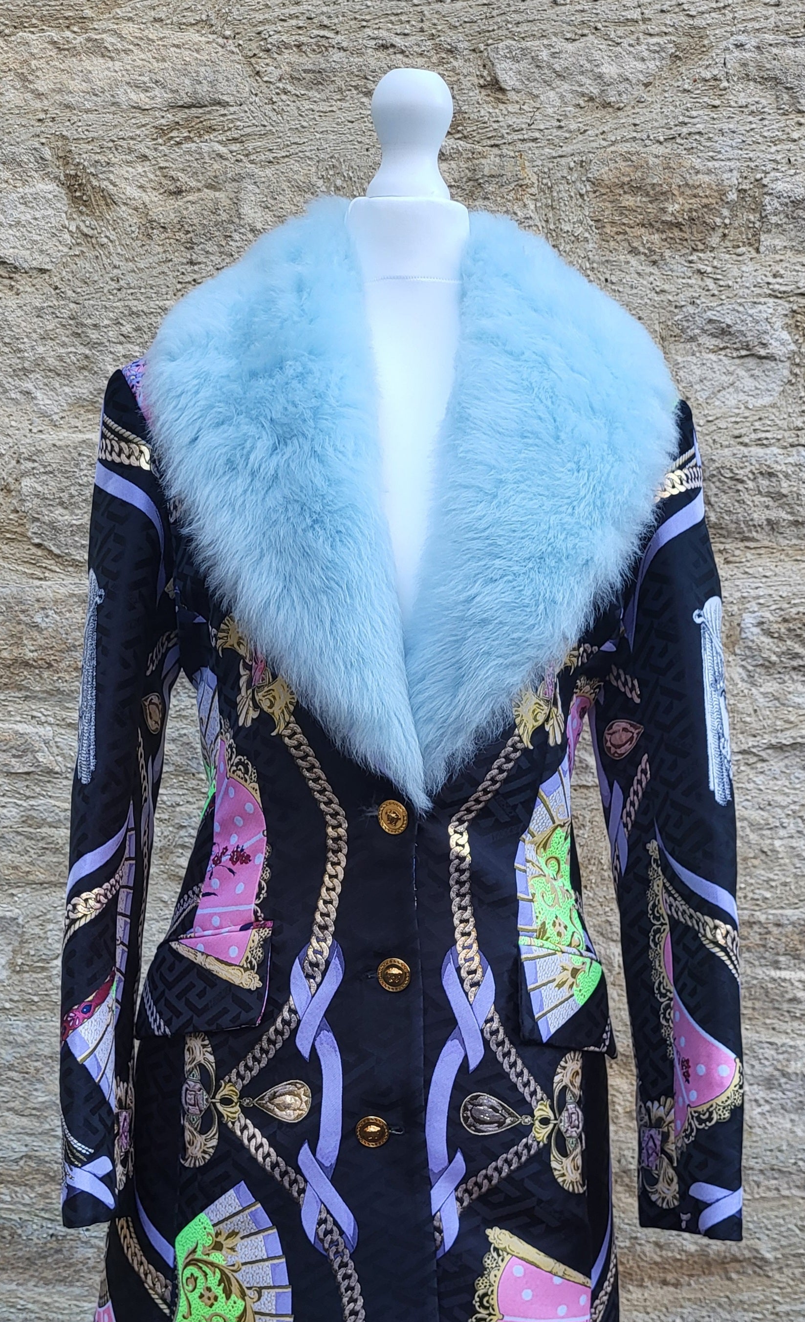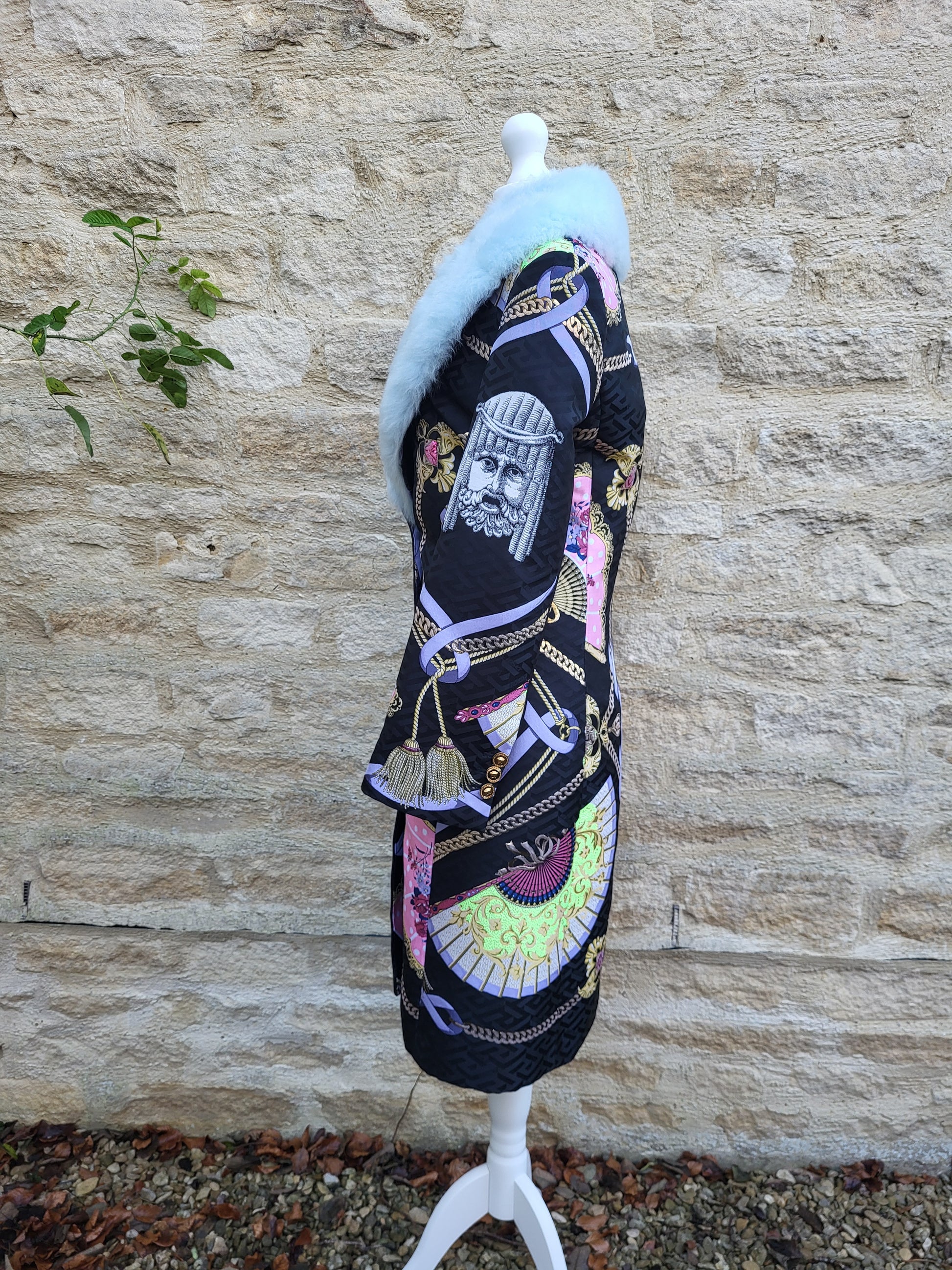 Designed during the early 2000s Versace era, this piece reflects the house’s bold, maximalist aesthetic under Donatella Versace’s creative direction. The coat showcases richly patterned brocade, gold-tone buttons and a sculpted, tailored silhouette. Its multi-panel design features pastel fans, chain motifs and illustrated emblems across a deep black base. Fully lined and expertly constructed, it presents a striking, elevated profile from every angle.