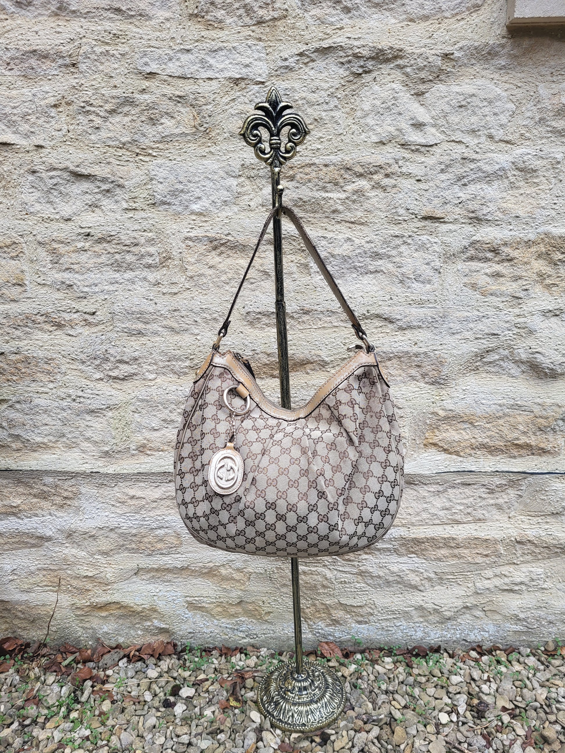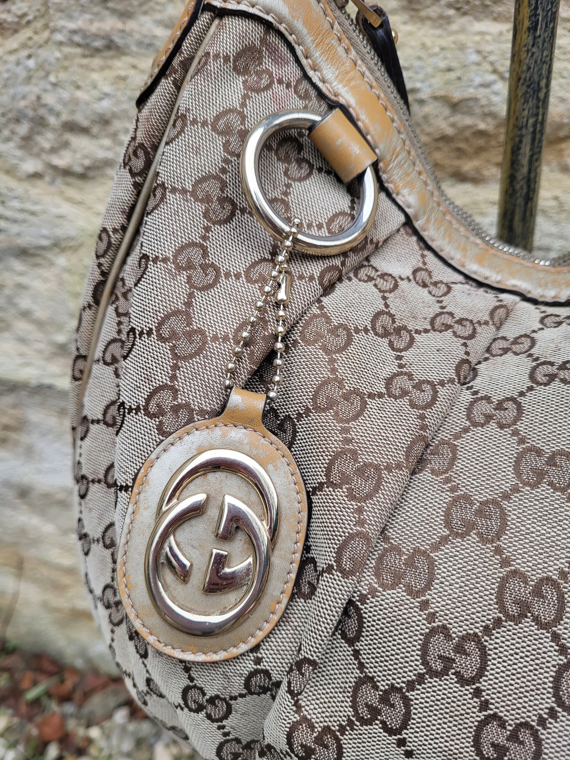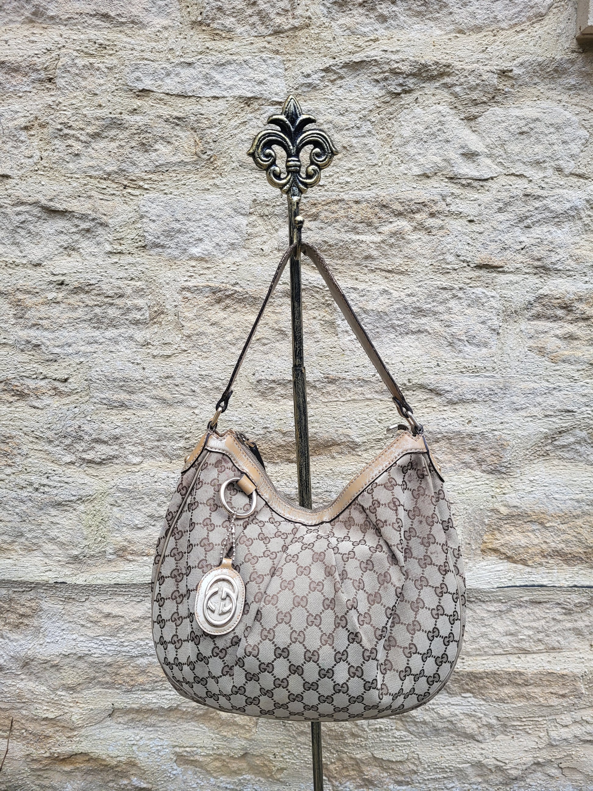 An effortlessly recognisable house classic — the Gucci Sukey in signature beige GG canvas with soft slouch silhouette and interlocking GG charm. A relaxed, everyday designer piece from the early 2010s era of Gucci. Crafted in monogram canvas with light tan leather trim and gold-tone hardware.