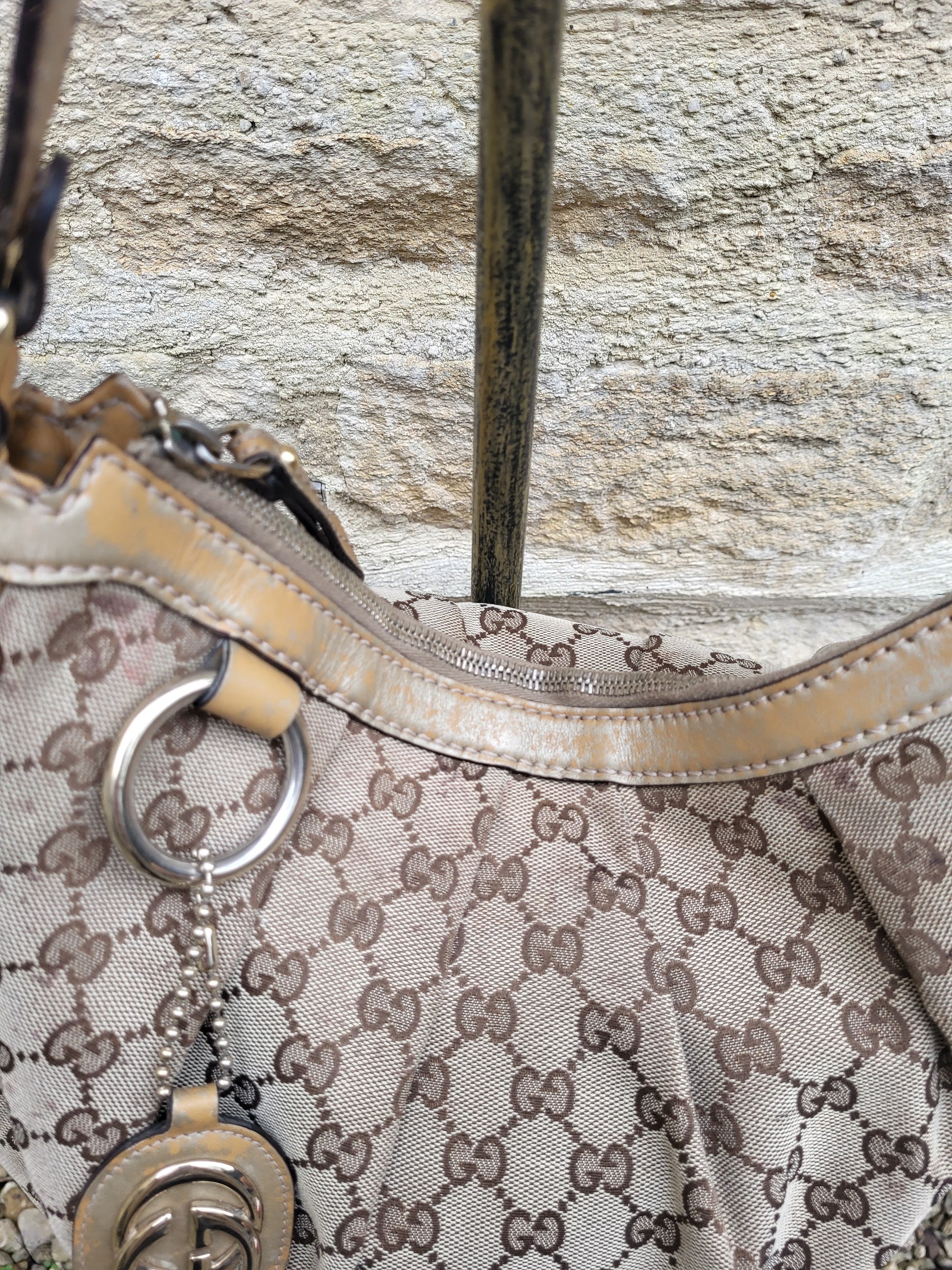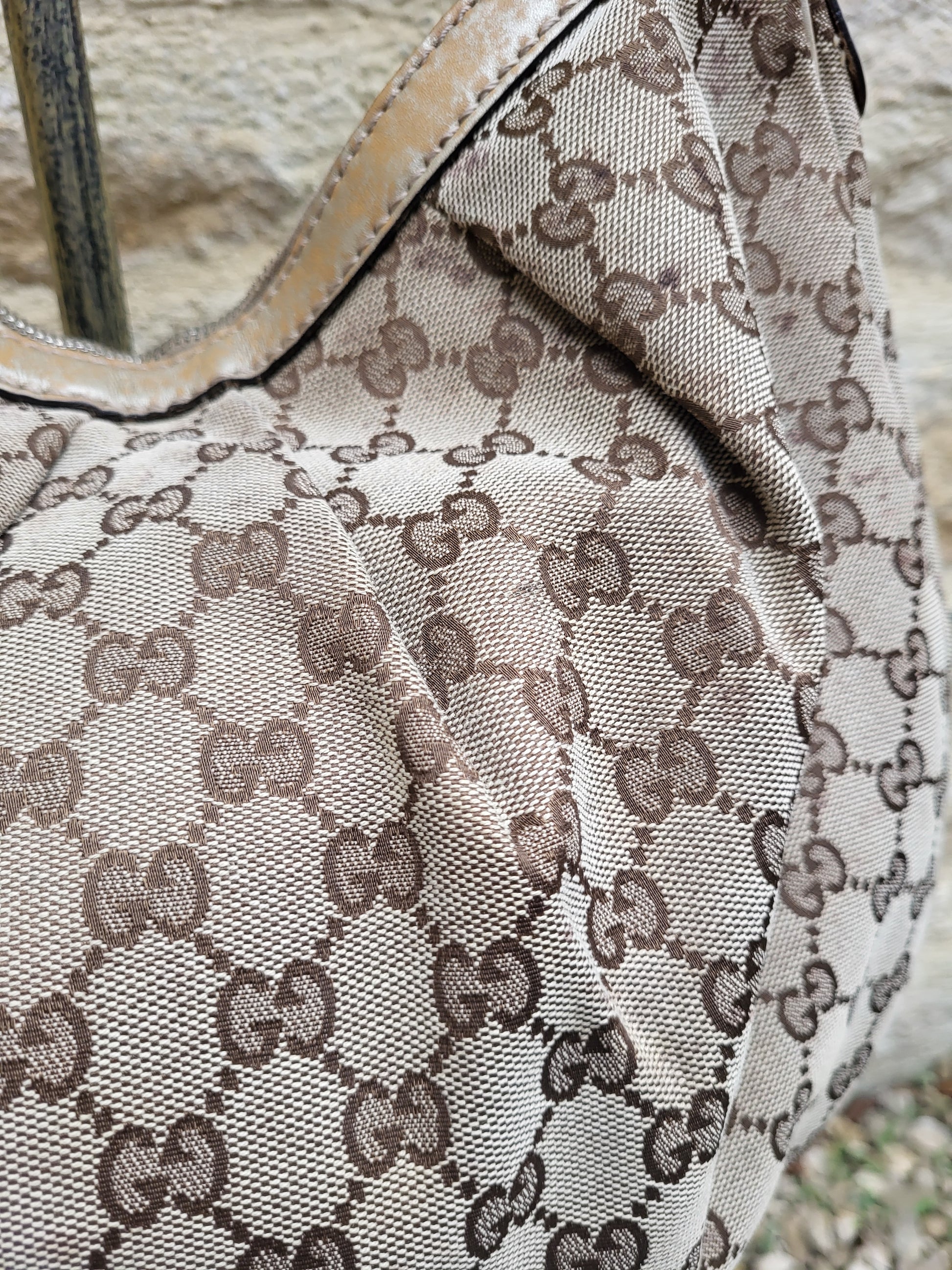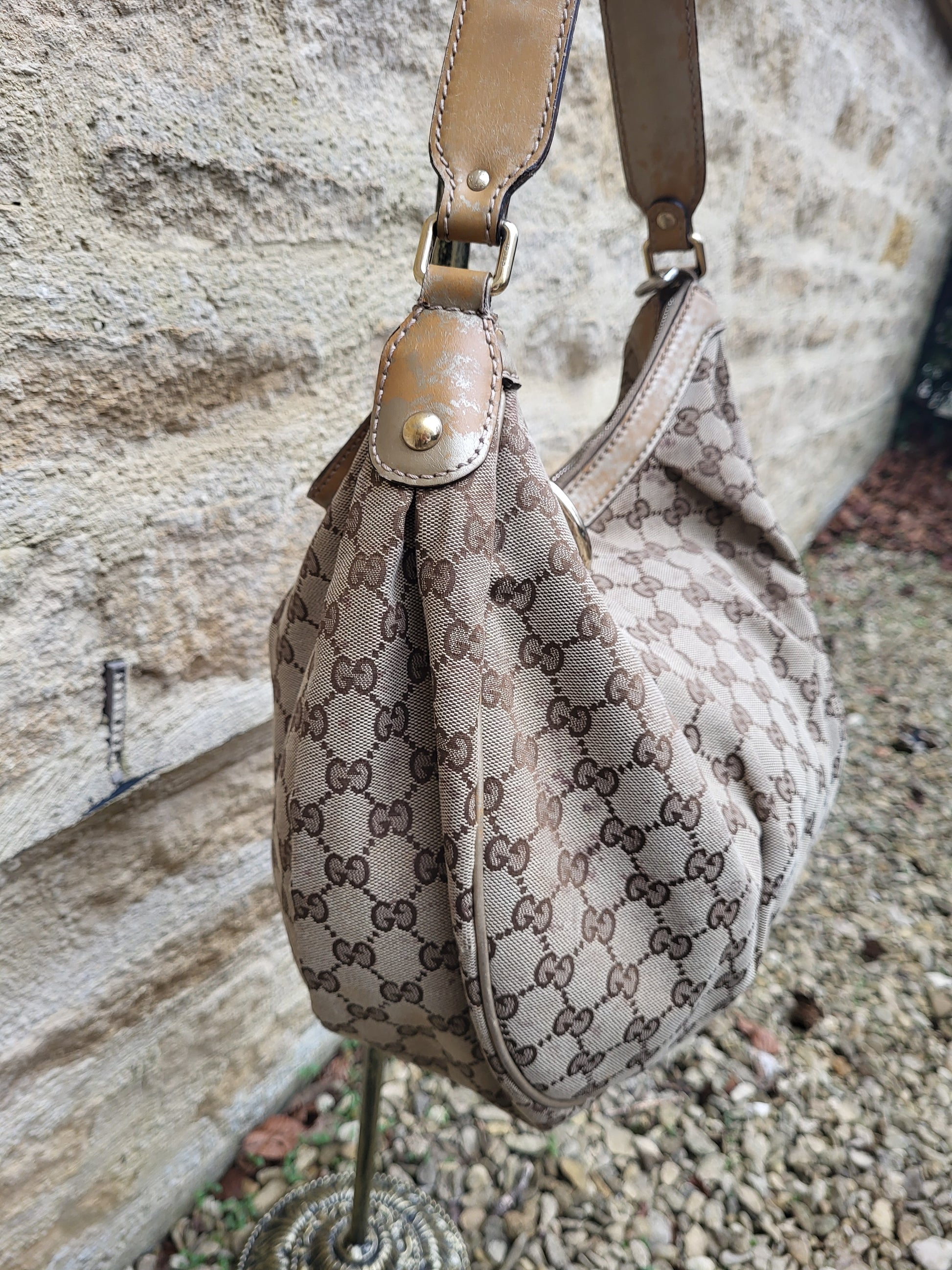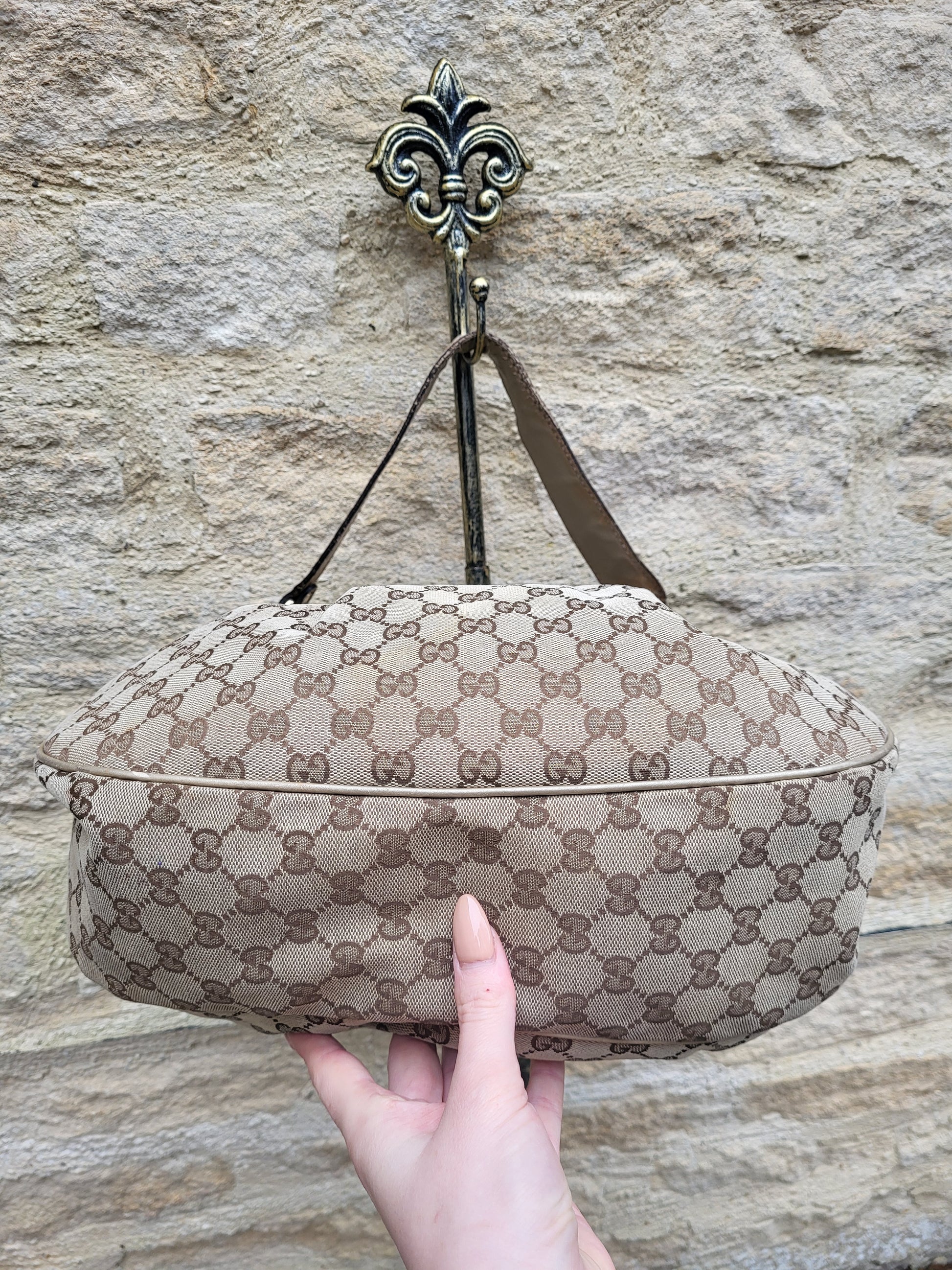 An effortlessly recognisable house classic — the Gucci Sukey in signature beige GG canvas with soft slouch silhouette and interlocking GG charm. A relaxed, everyday designer piece from the early 2010s era of Gucci. Crafted in monogram canvas with light tan leather trim and gold-tone hardware.