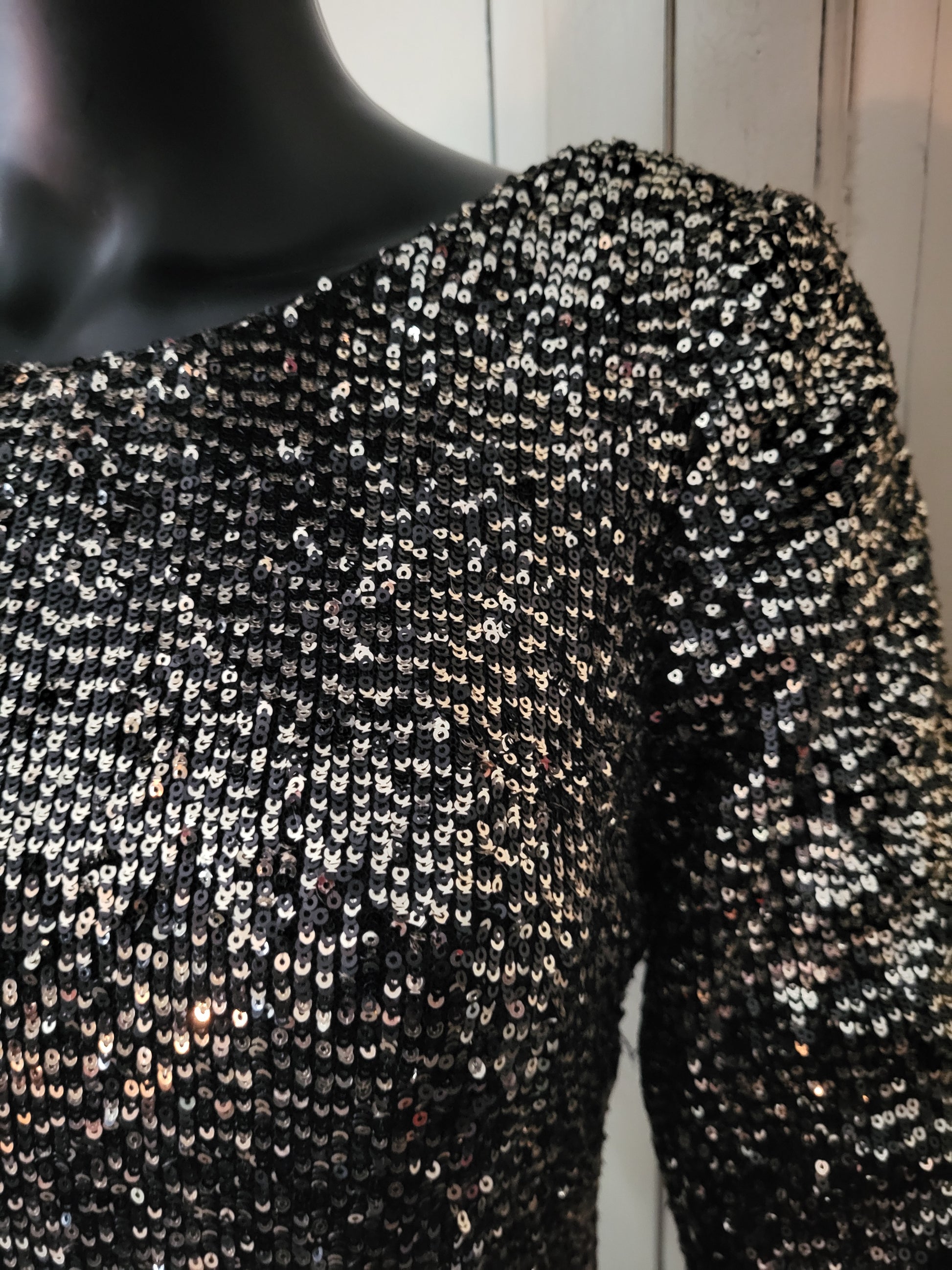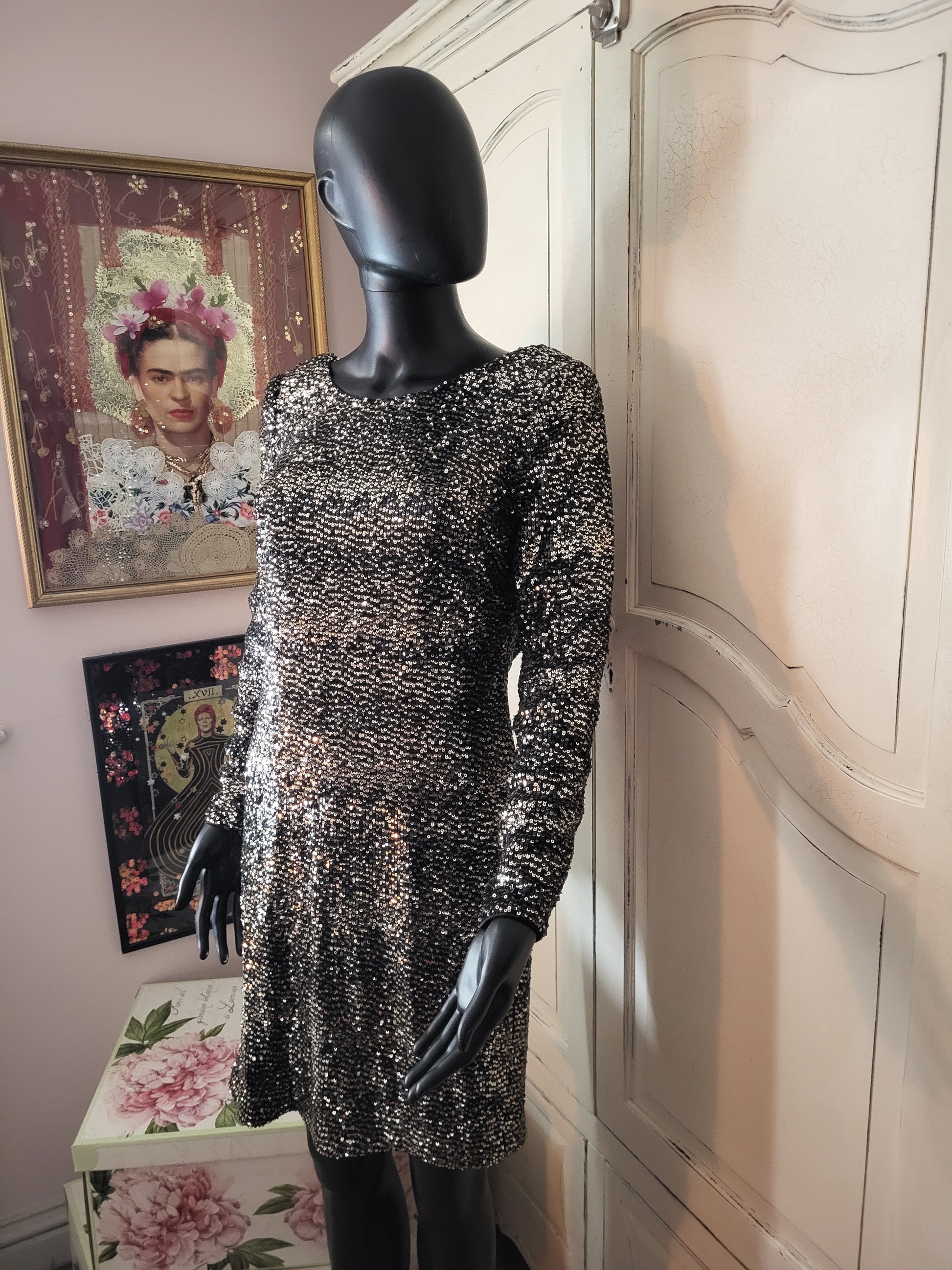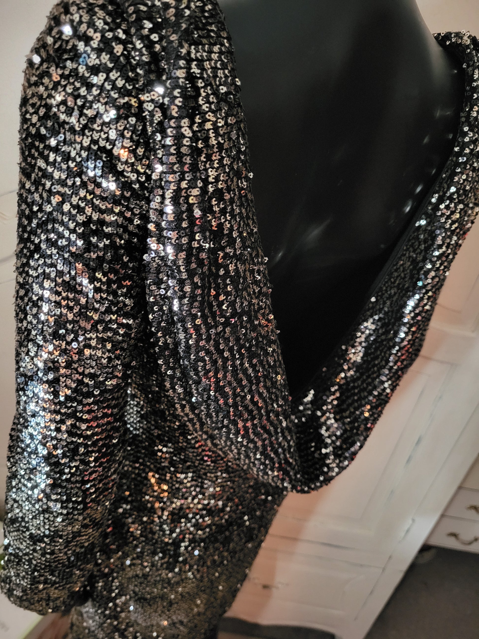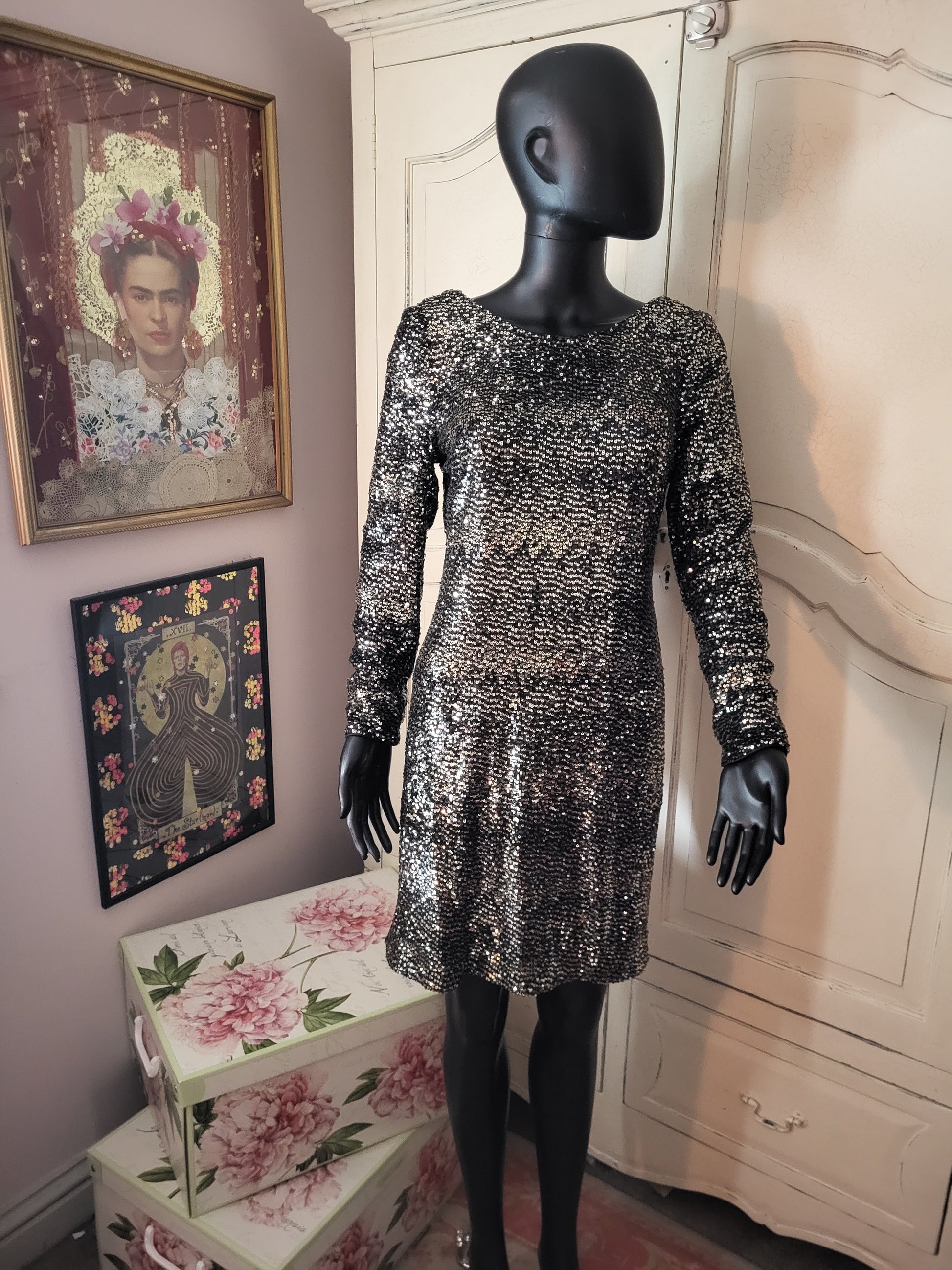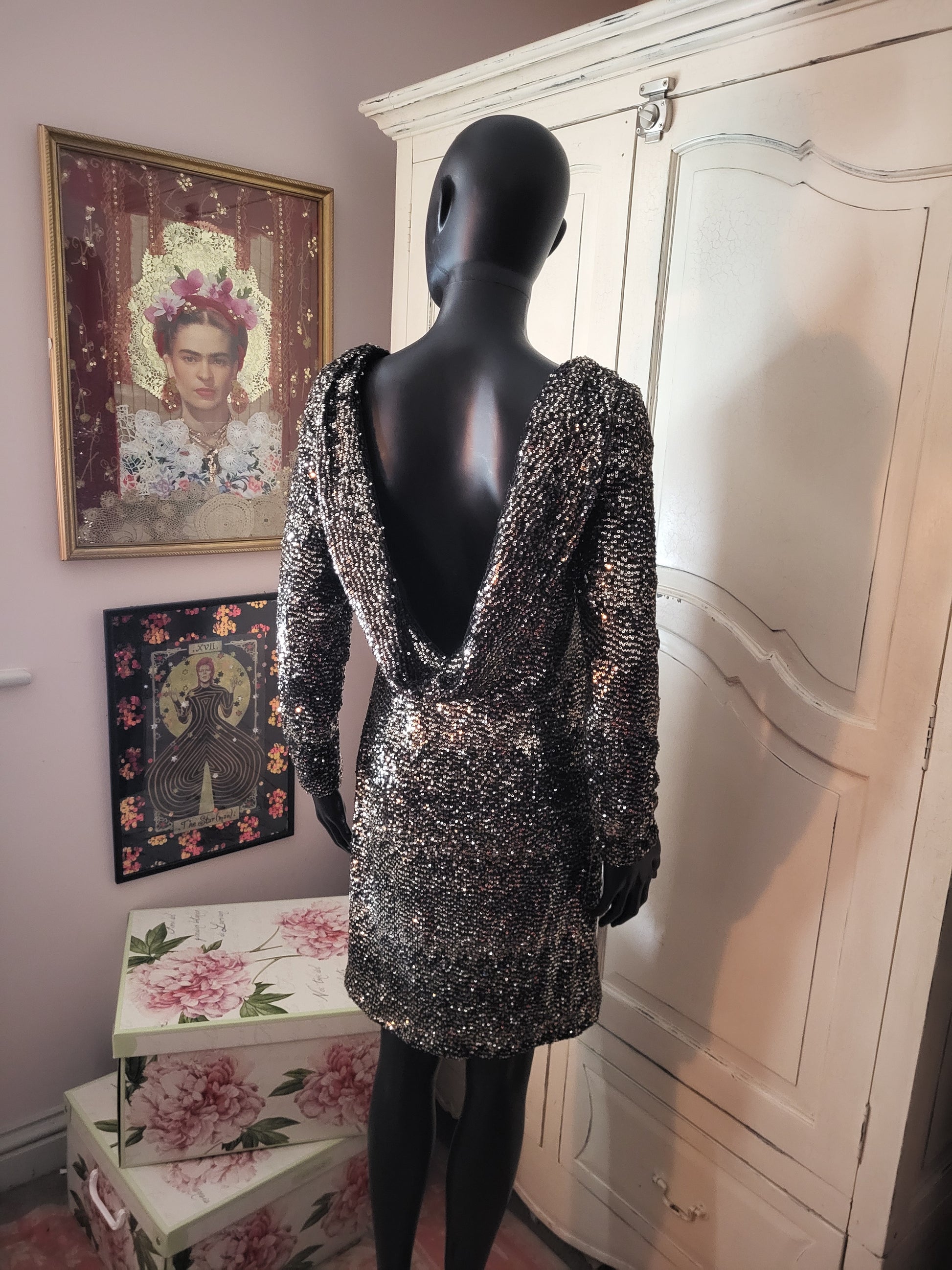 Step into the spotlight with this dazzling BIBA sequin dress. Designed in a unique palette of black, gold, and silver, it is fully embellished with gorgeously sparkly sequins. The striking silhouette features long sleeves and a mini length cut, balanced by a dramatic low cowl back that adds instant glamour!