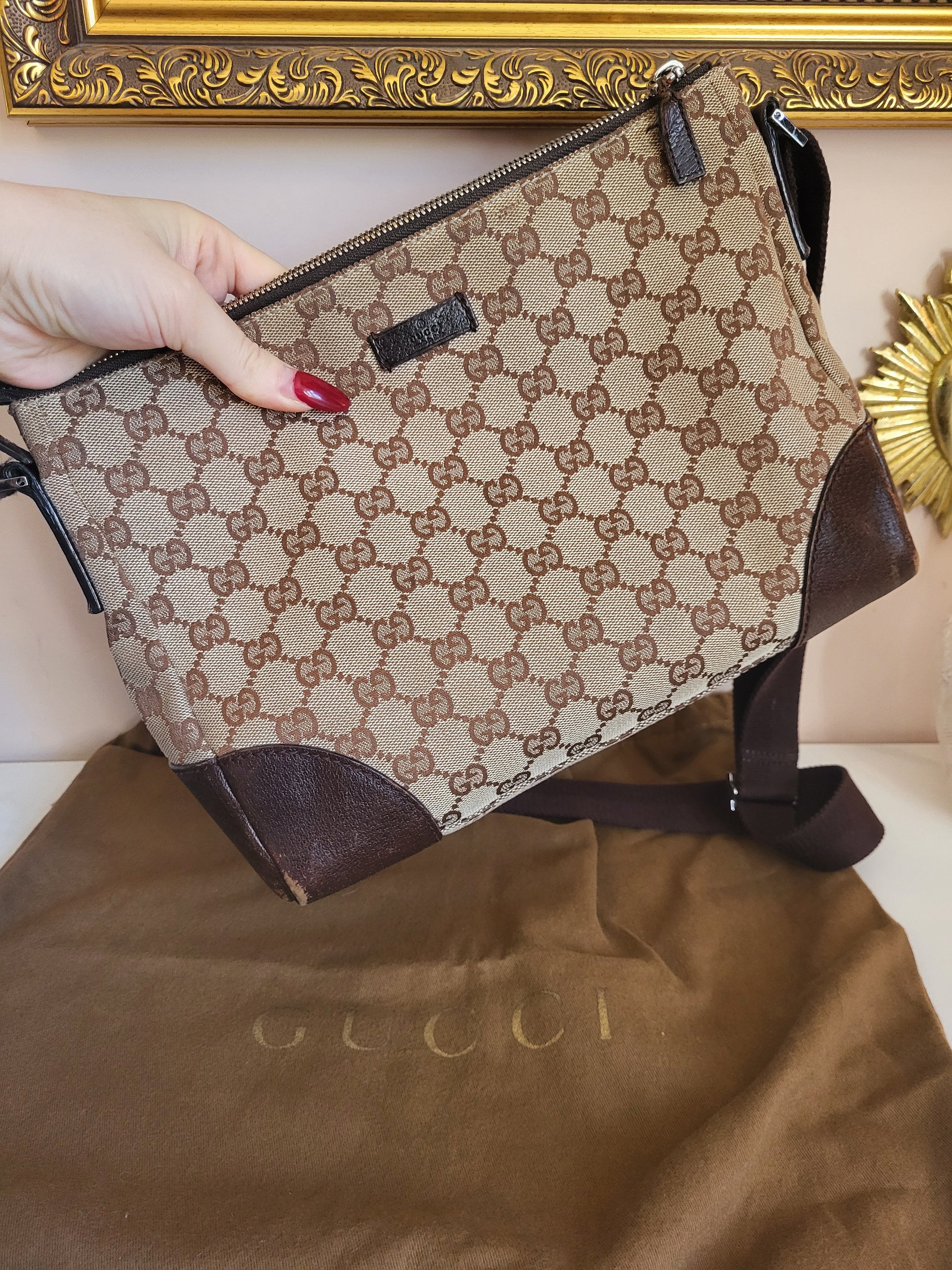 Beige and brown GG canvas with chocolate leather trim and silver-tone hardware. Adjustable canvas strap, zip fastening, and versatile styling — wear crossbody, over the shoulder, or as a clutch.