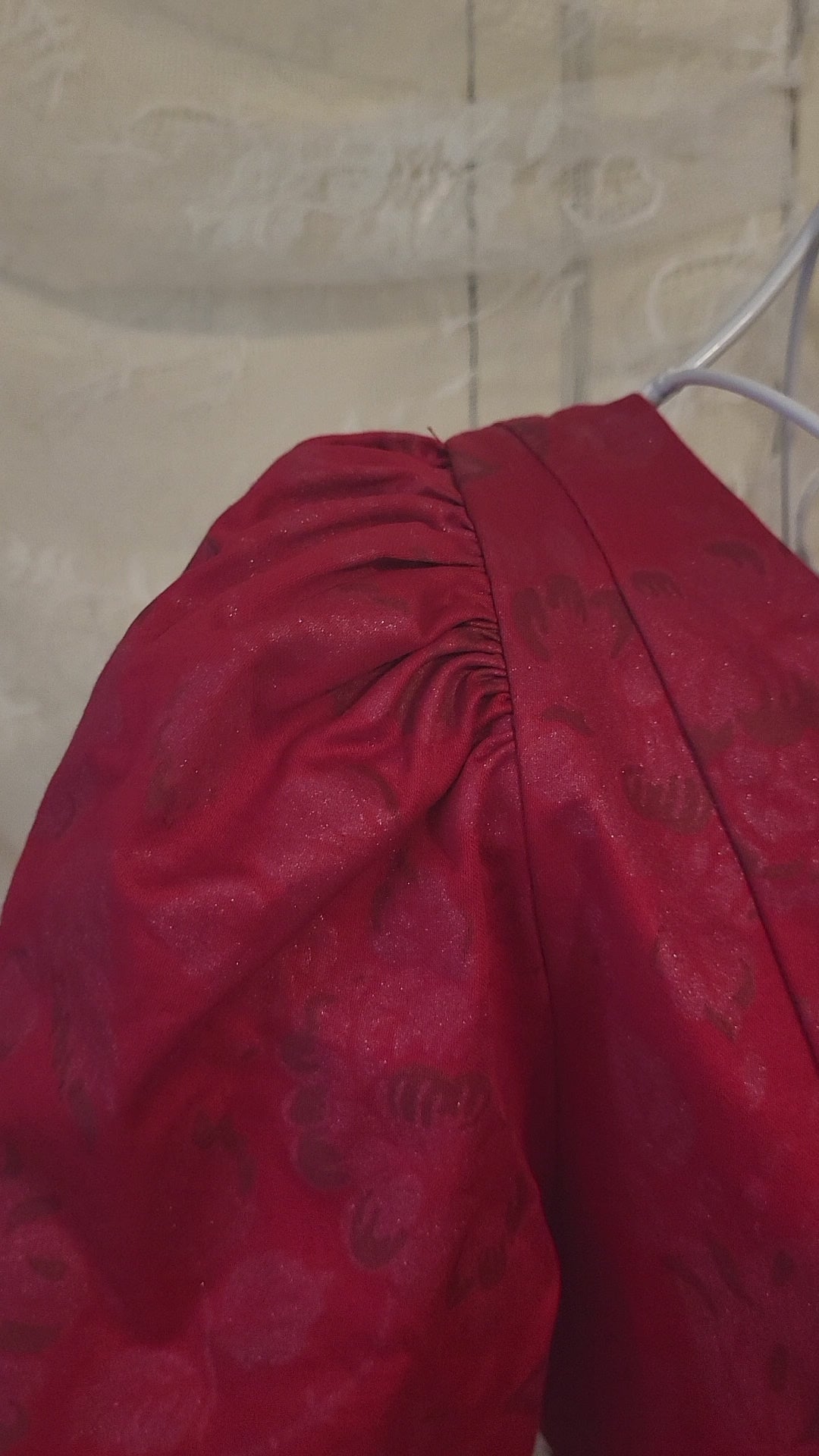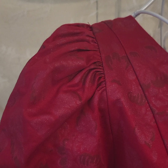 A crimson rose-jacquard cotton gown from Laura Ashley’s romantic early 1980s era. Featuring puffed sleeves, a sculpted sweetheart neckline, covered buttons, and a full gathered skirt. Made in Great Britain from 100 % cotton.