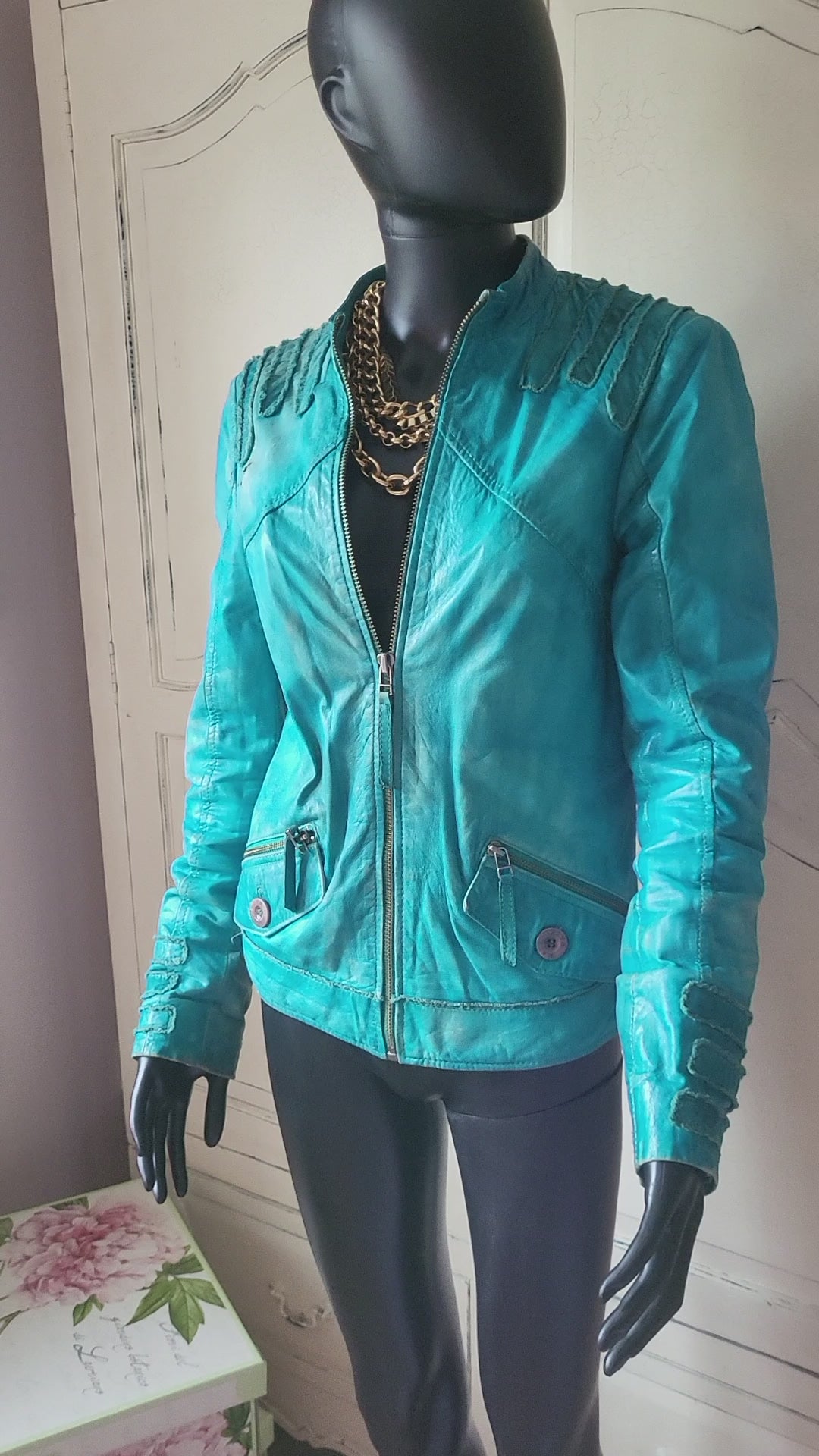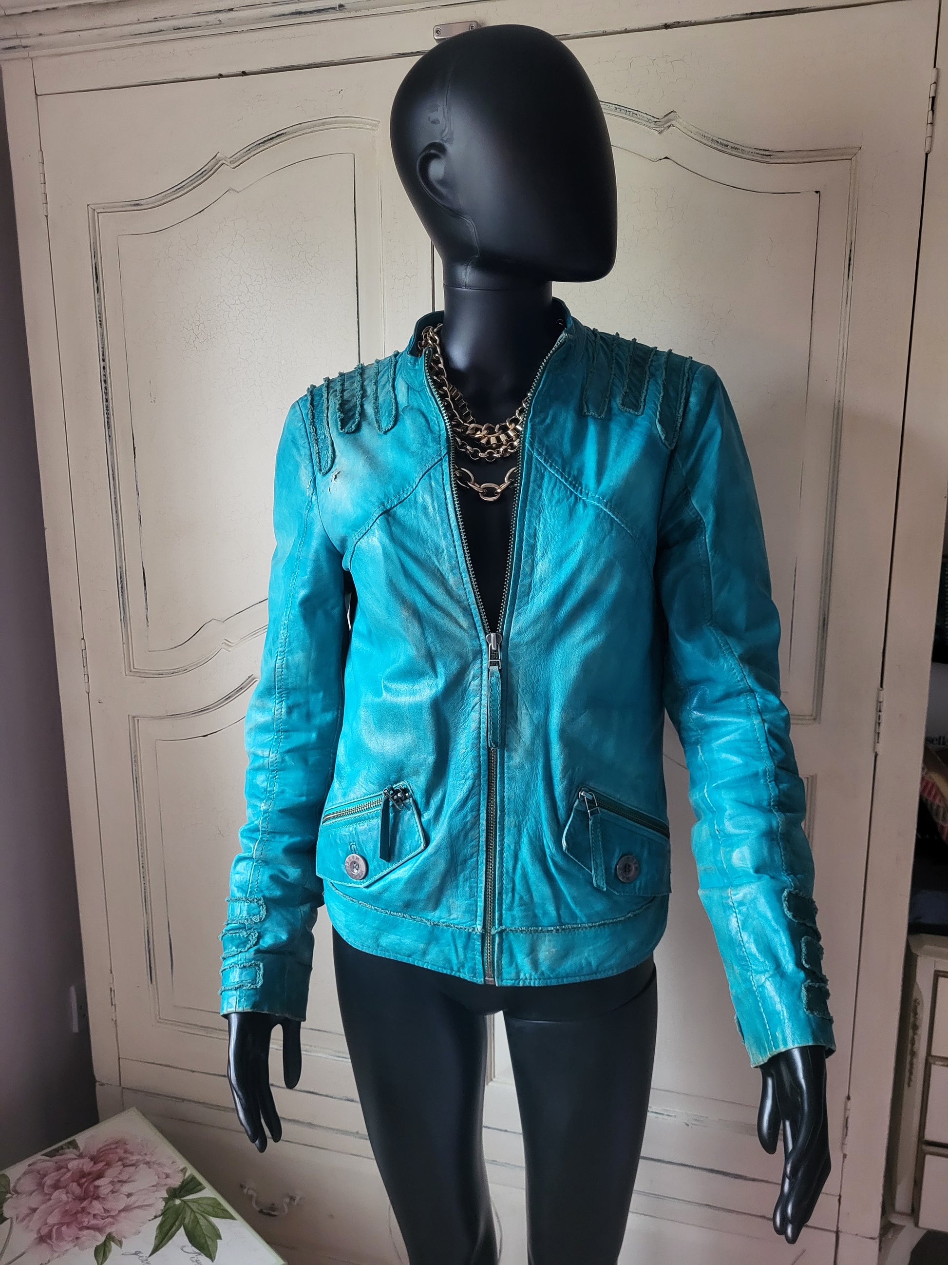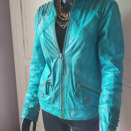 Vintage Maje Turquoise Distressed Leather Jacket