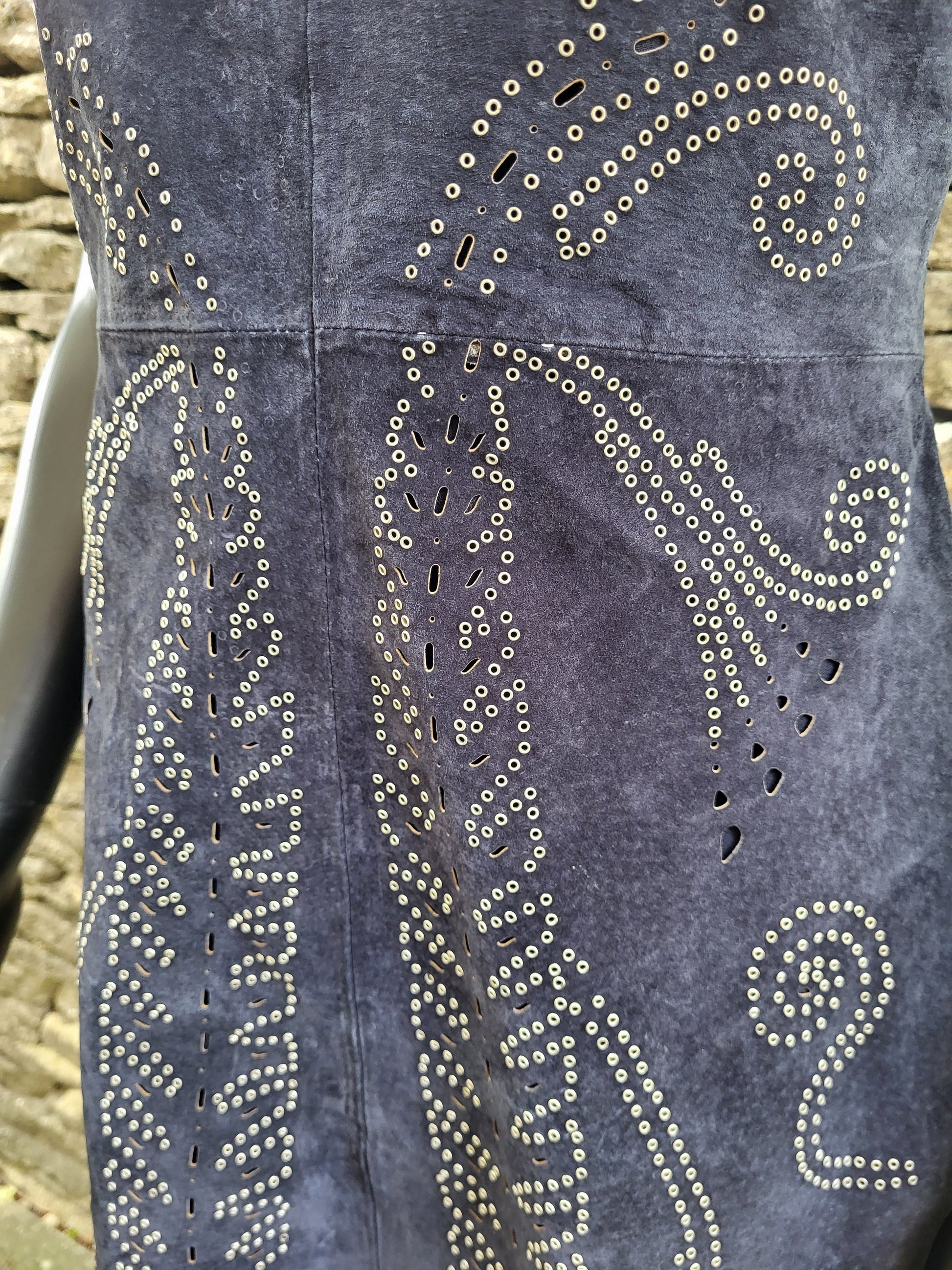 A rare suede shift dress with ornate studded detailing, reminiscent of late 60s/70s fashion. A genuine collector’s piece — not perfect, but all the more authentically beautiful for it. This wonderful piece wears the essence of time with personality and grace.