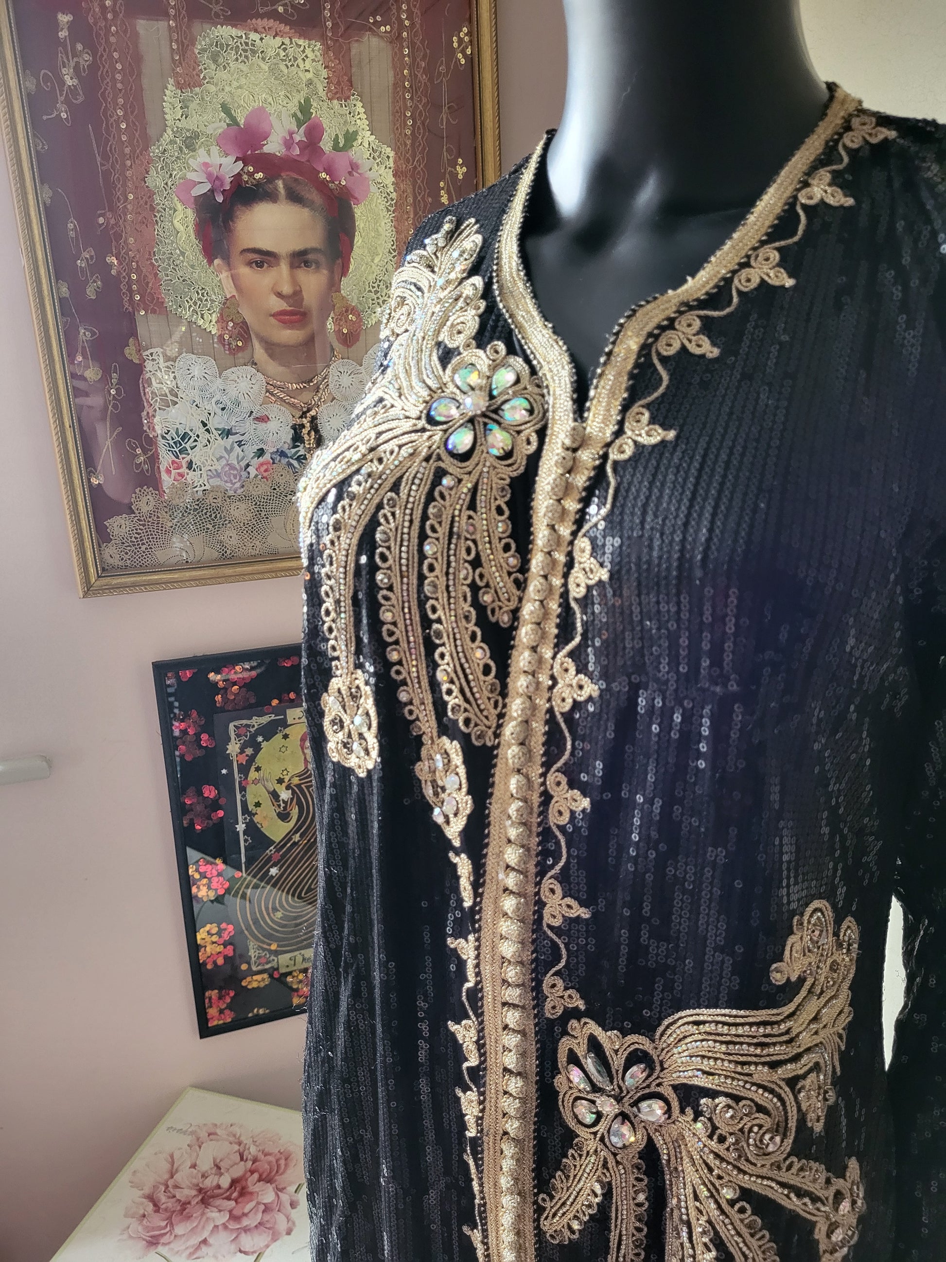 A truly unique piece blending Egyptian and Moroccan influences, this robe is a rare find that exudes timeless glamour. It features hand-embroidered sequins fully covering the garment, curating a look that is both exotic and elegant. Unique and characterful, it’s a statement garment that carries wonderful artistry!