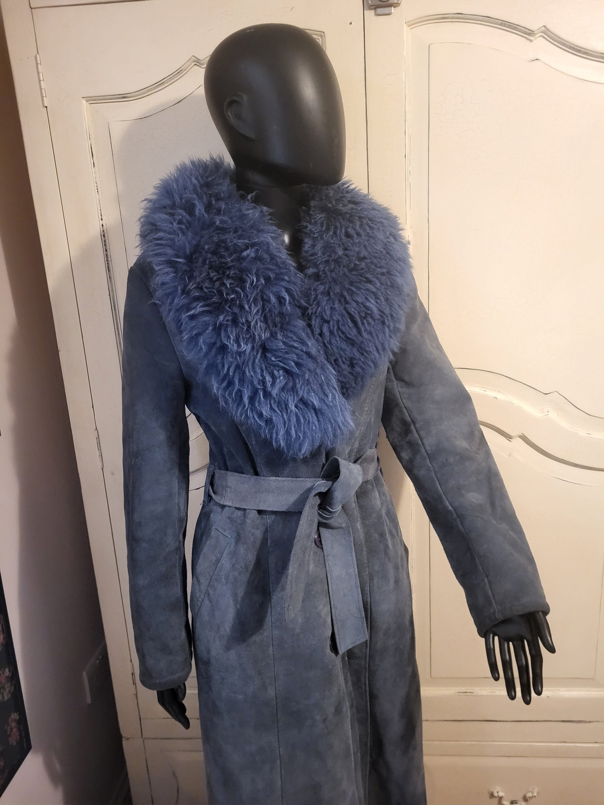 A beautifully luxurious Coat from Penny Lane. Rich Suede envelopes you whilst the full Shearling collar adds extra warmth and opulence.