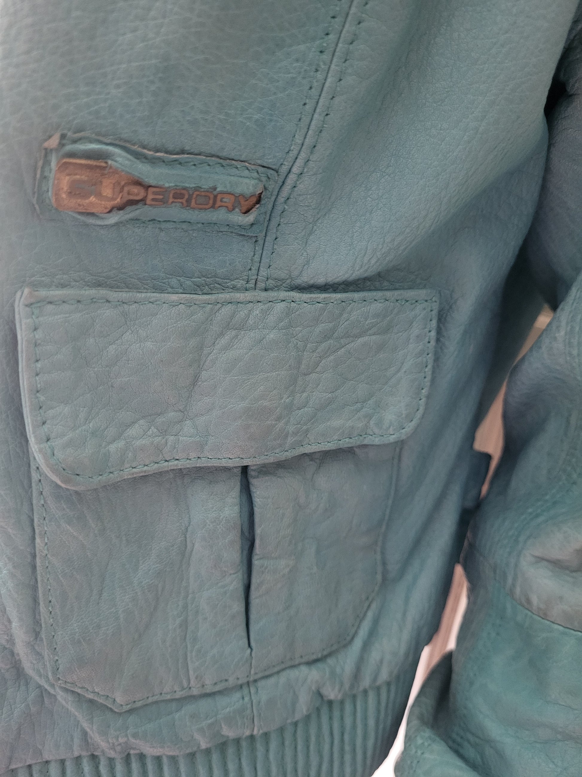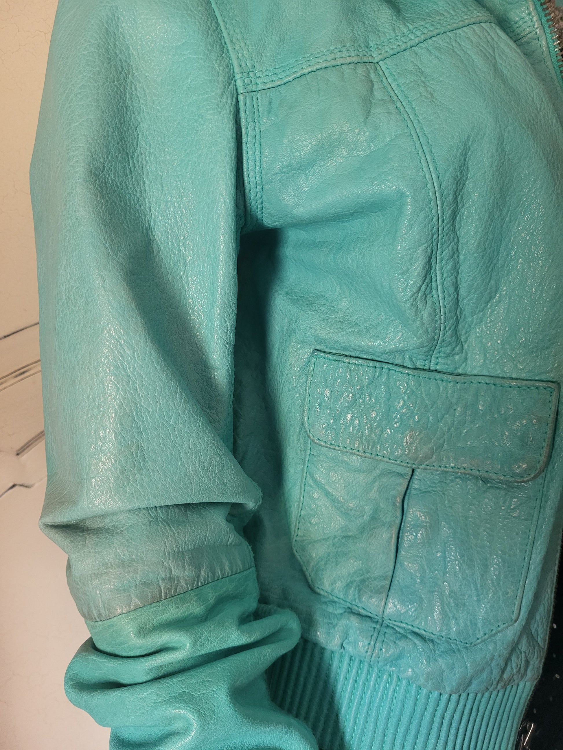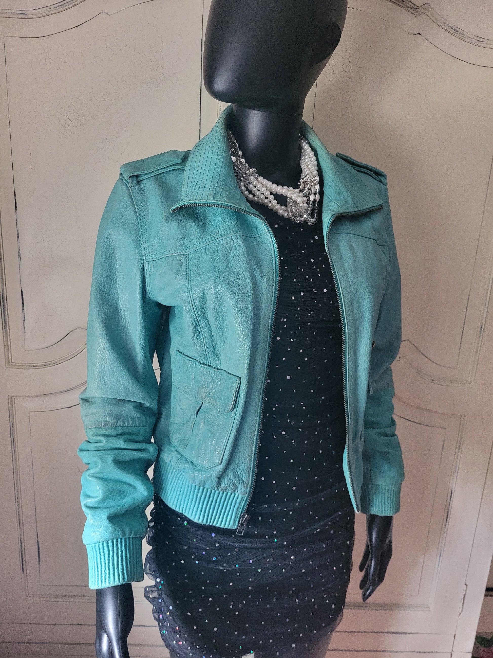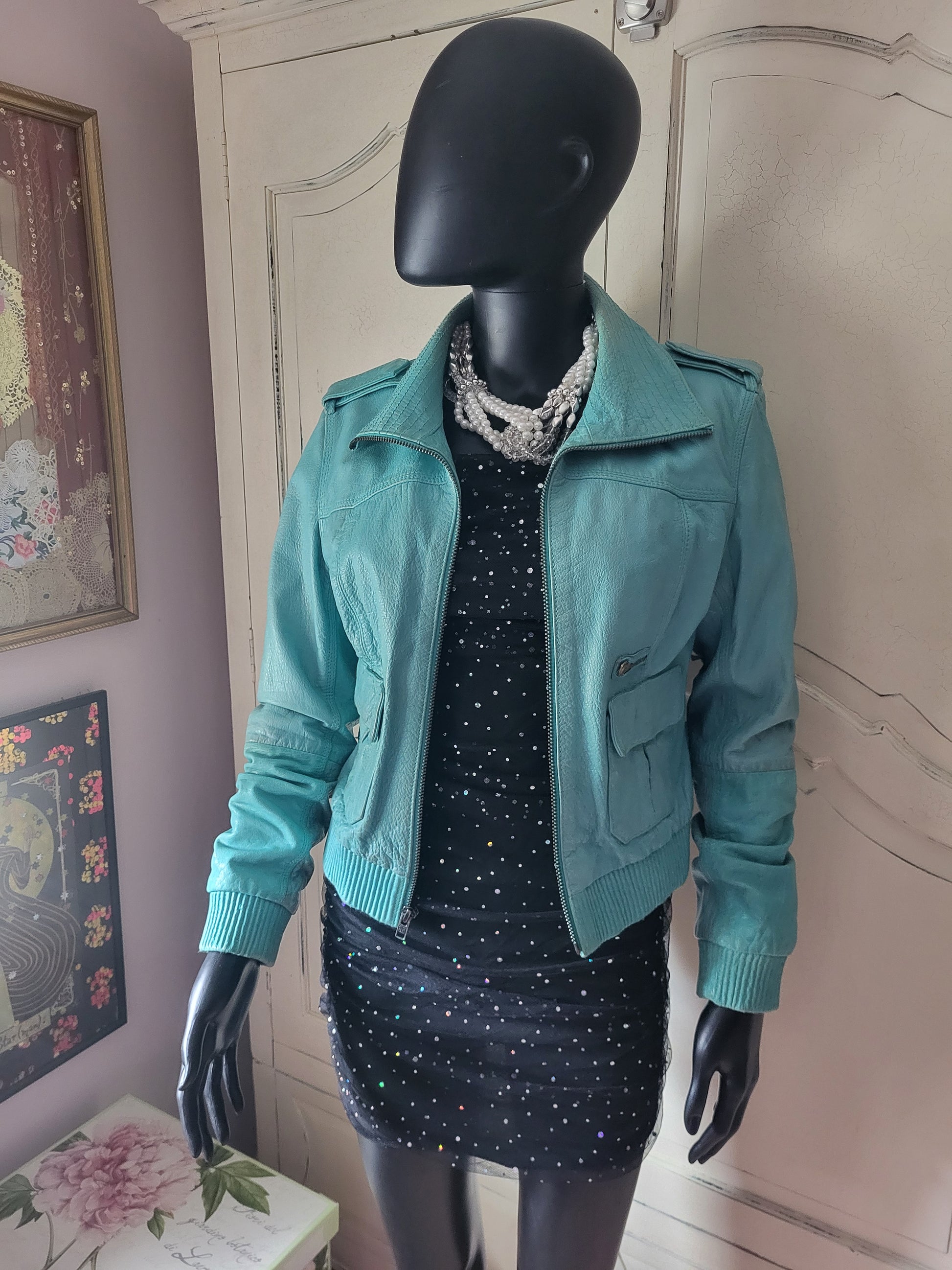 A gorgeously soft leather jacket, distressed in just the right amount to make this the perfect throw on piece! The colour is a lovely rich turquoise Aquamarine. The jacket is heavy and of excellent quality. A lovely piece that will last.