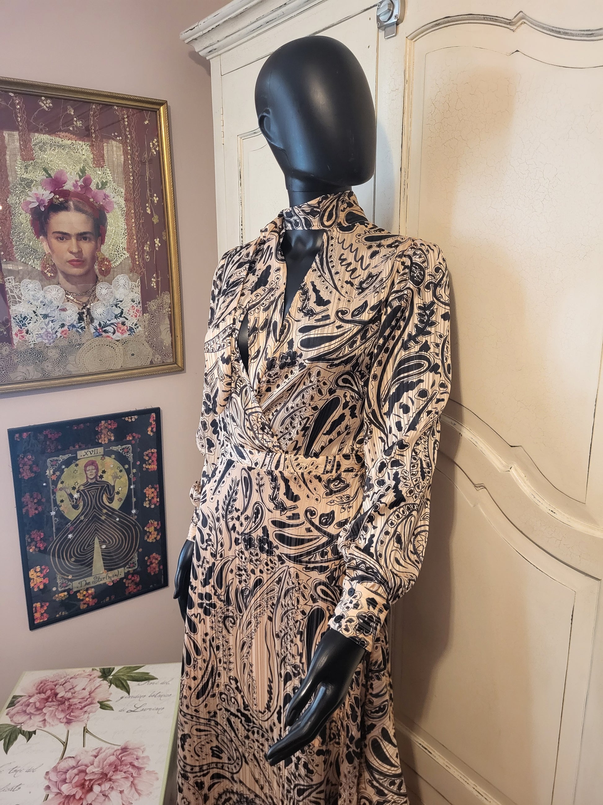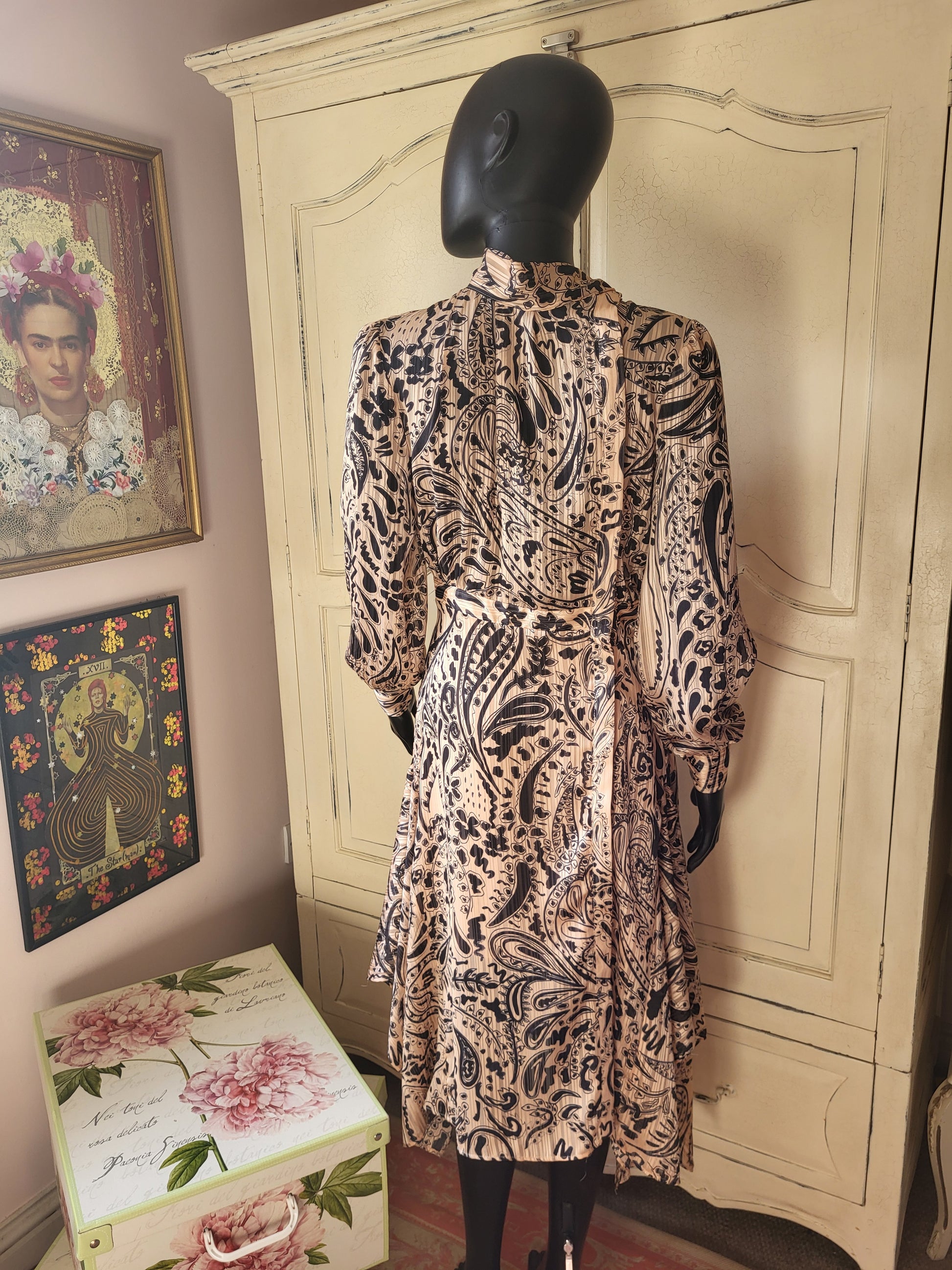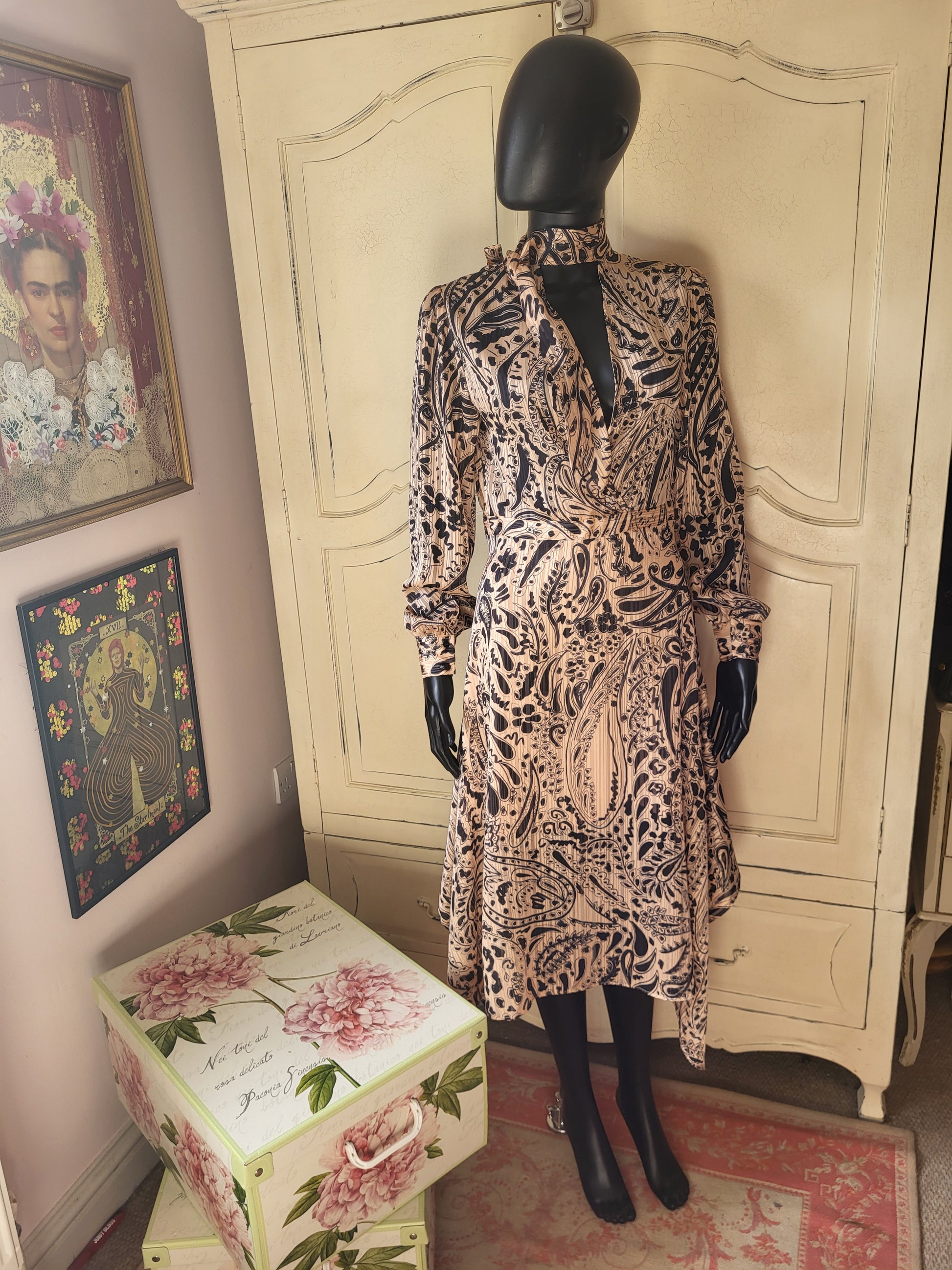 Step into retro-inspired elegance with this vintage Topshop paisley print dress in a soft blush and inky black palette. Featuring a dramatic plunge neckline and a chic self-tie neck detail, this piece blends femininity with a bold, bohemian edge!