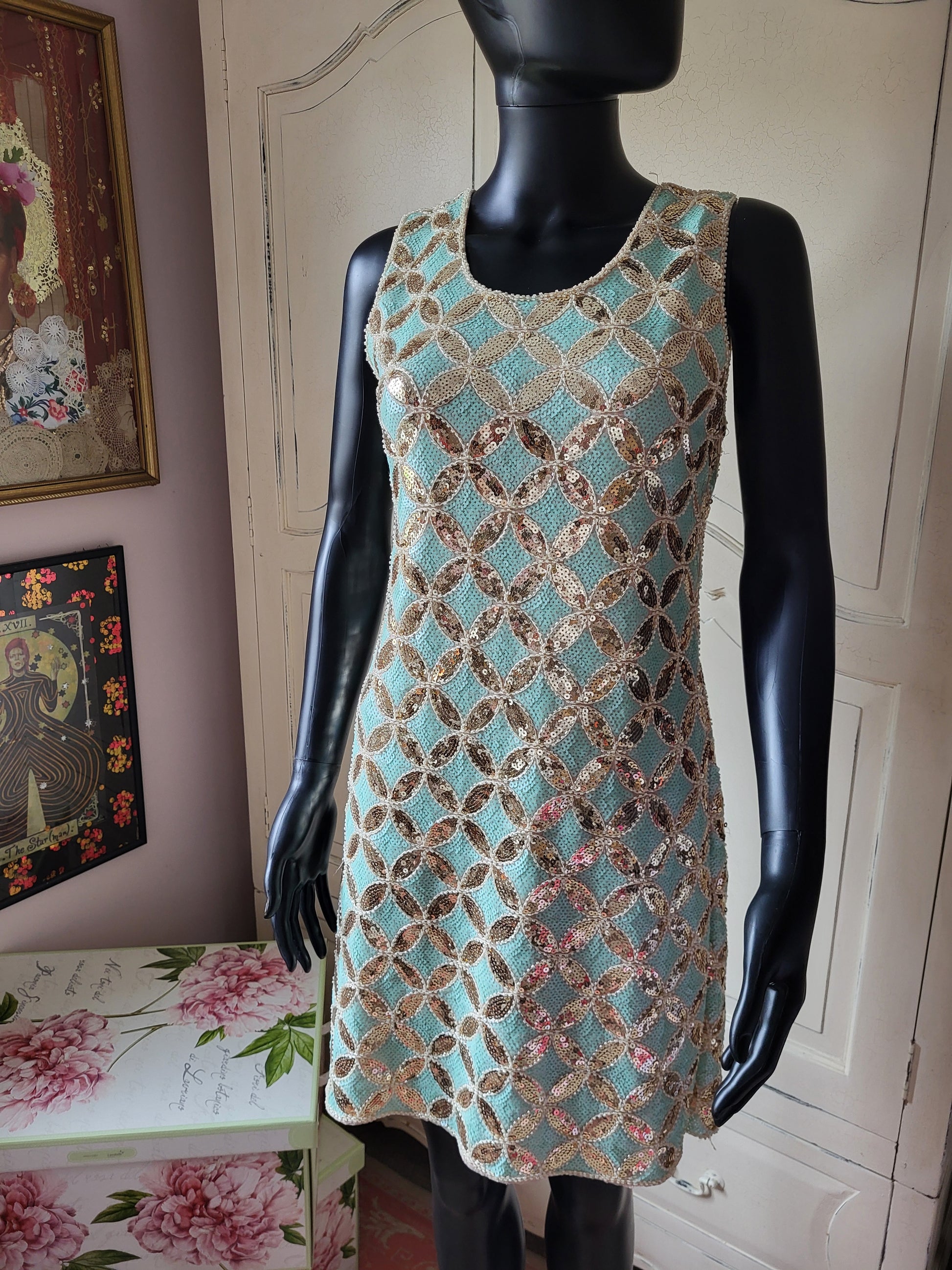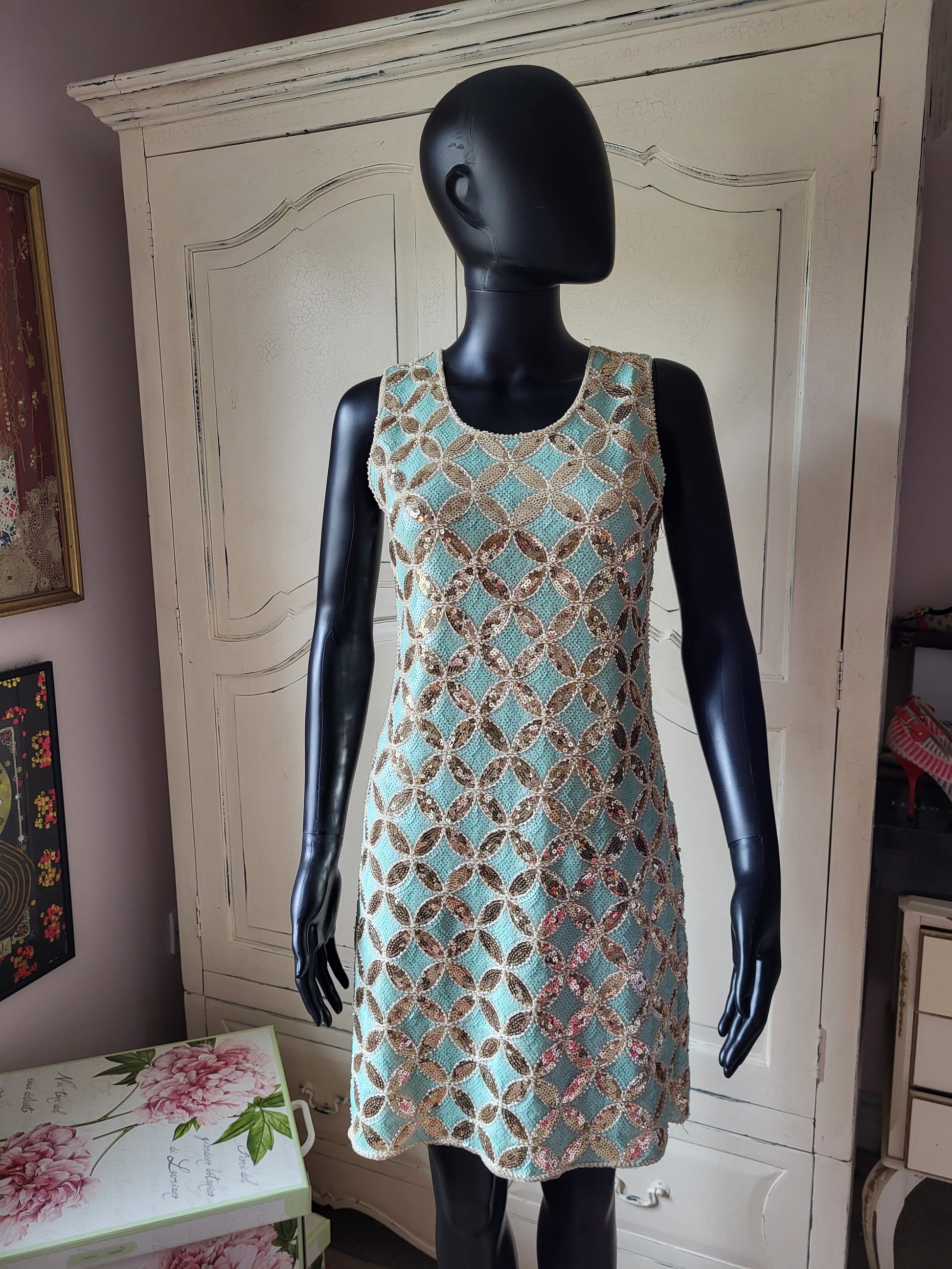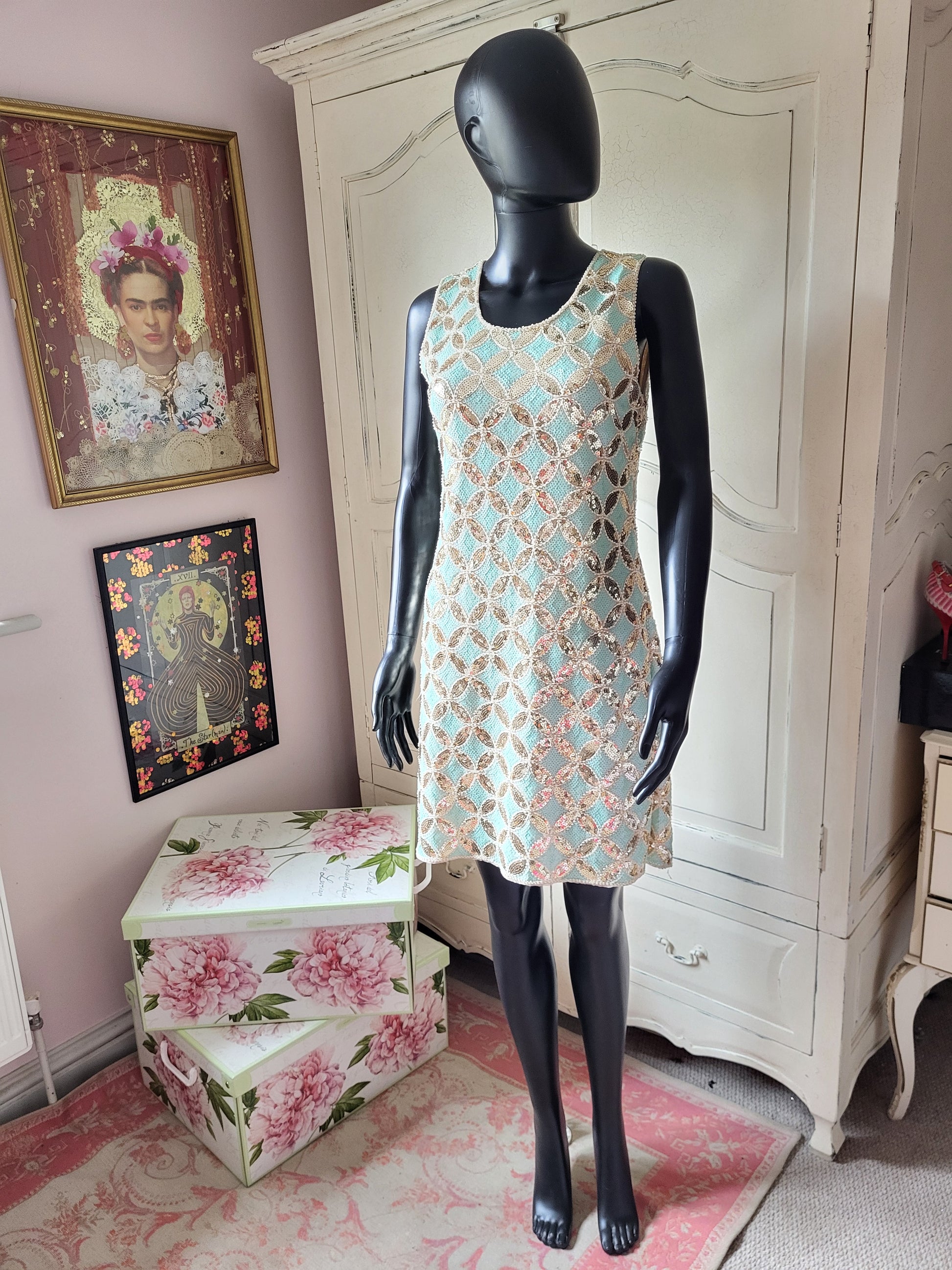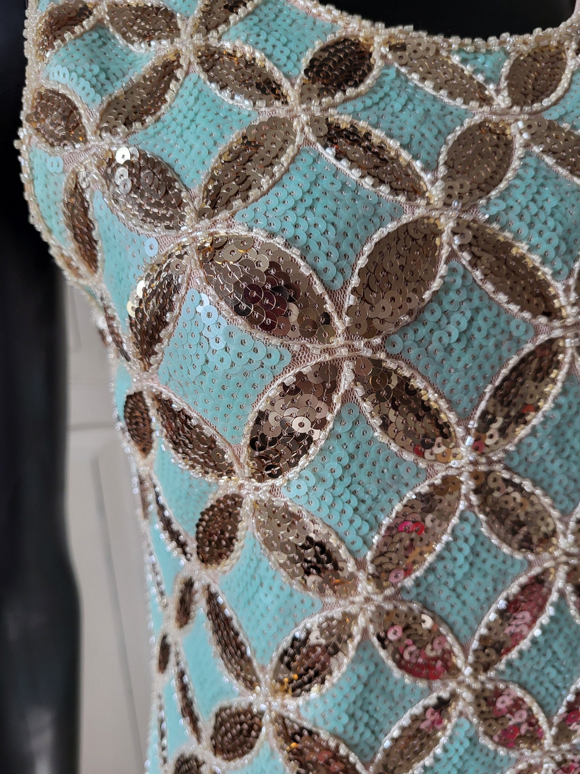 A gorgeous Vintage piece featuring turquoise and gold sequins. In a 1920s shift style, this would be fabulous for parties.